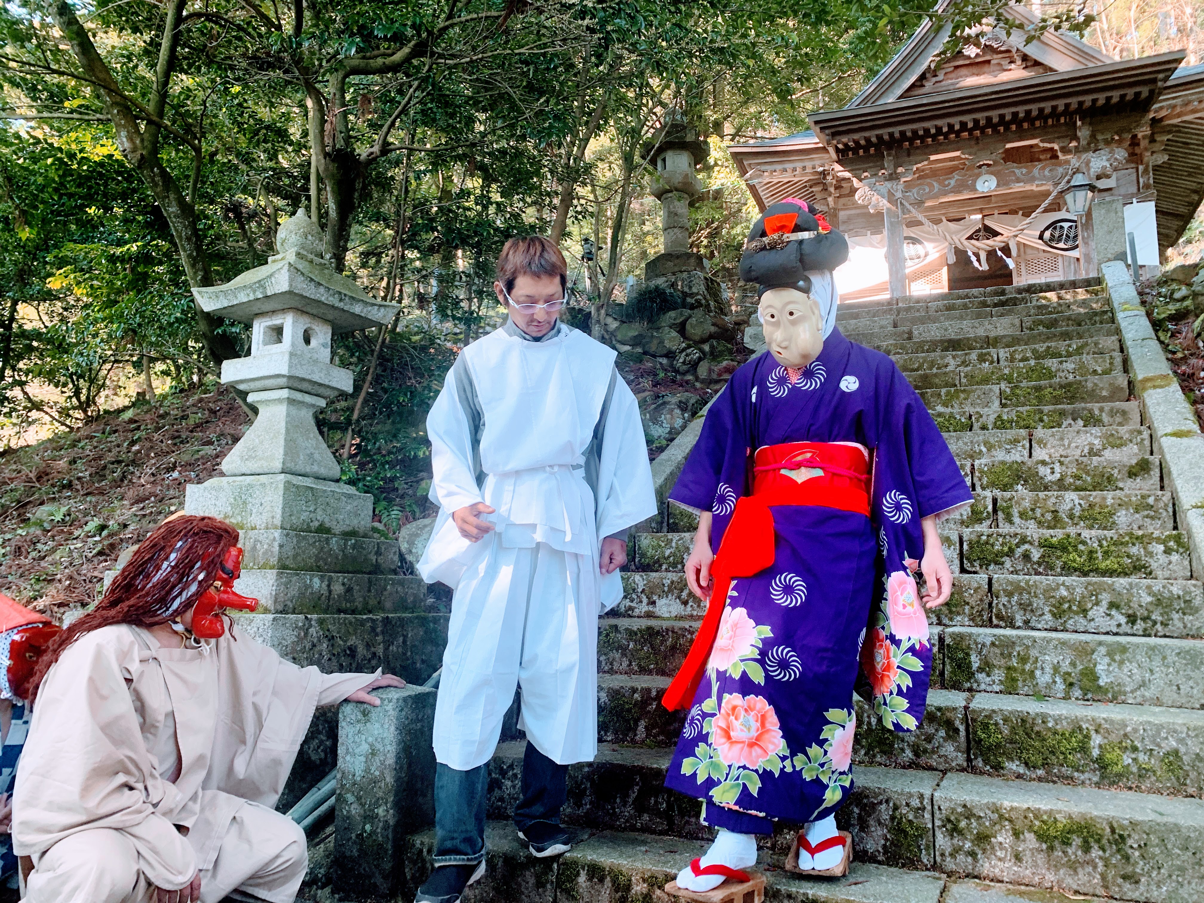 一行は千光寺観音堂の周りを7回半回った後、最後はお堂の前に神輿を置いて神主さんが会釈して(神仏混淆か!)、無事に神事は終了しました。それでは最後に動画をご確認ください。各キャラクターの動きに注目!