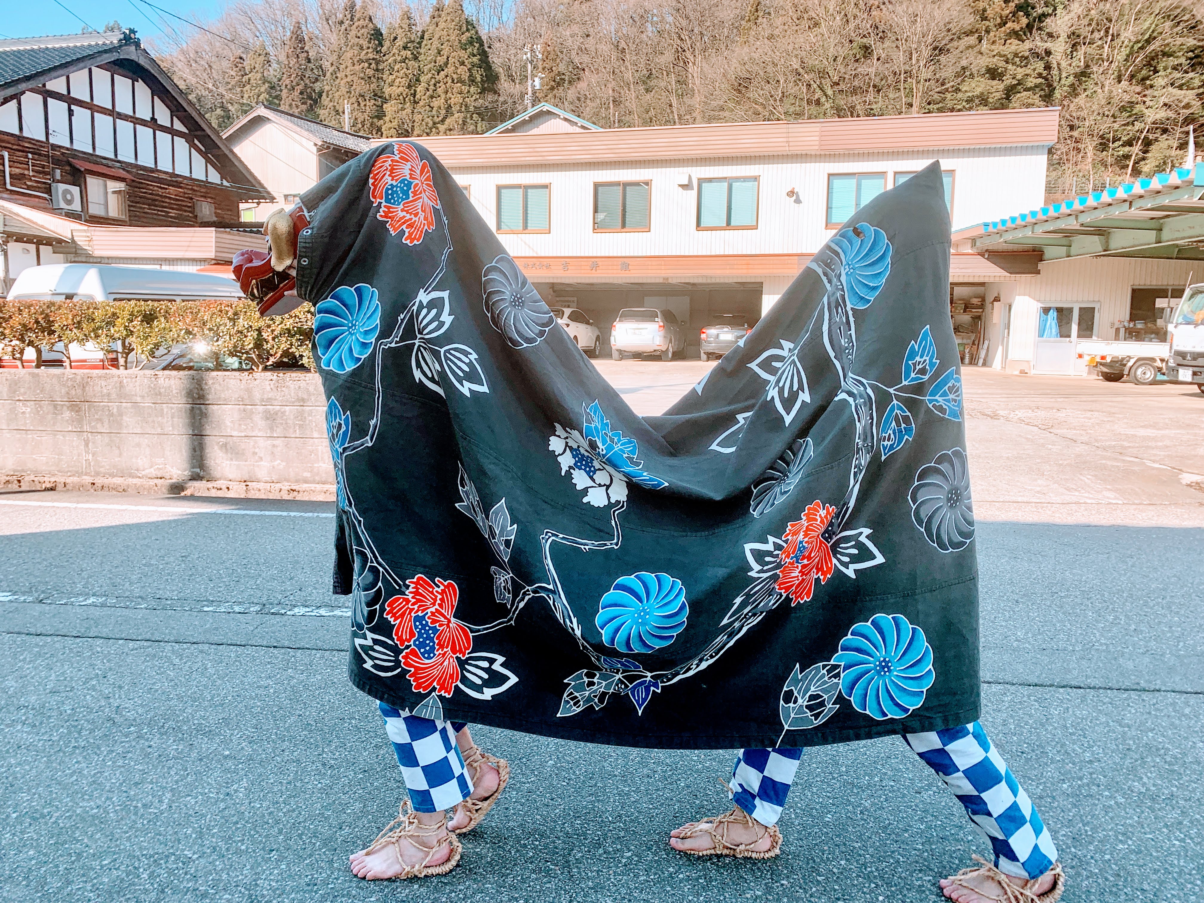 行道獅子。行道獅子は、形態としては二人立ちで、テクテク歩いて特に舞らしい動きはない歩行タイプの獅子舞。数々の獅子舞のバリエーションを誇る獅子舞王国・富山県でも唯一の古式ゆかしい貴重種であり、古い箱型の獅子頭「箱獅子」を使い、その鼻には梵字が刻まれているんだとか。