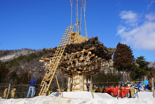 祭りで使う社殿は1月14日から1月15日の昼にかけて、厄年の男性たちが中心になって建設されます。高さ10メートルにも及ぶ社殿は木材や麻縄で作られ、釘は1本も使わないのだそうです。