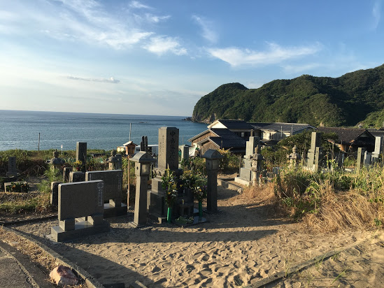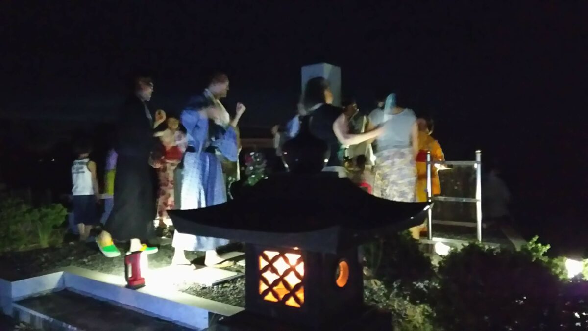 陸上のお墓は海に面しており、墓場の地面も砂地になっています。少々踊りづらいですが、これもまた地域性を反映した盆踊りという感じで面白いです。かつては浜辺近くの曹洞宗隣海院でも盆踊り大会が開催されていたそうです。