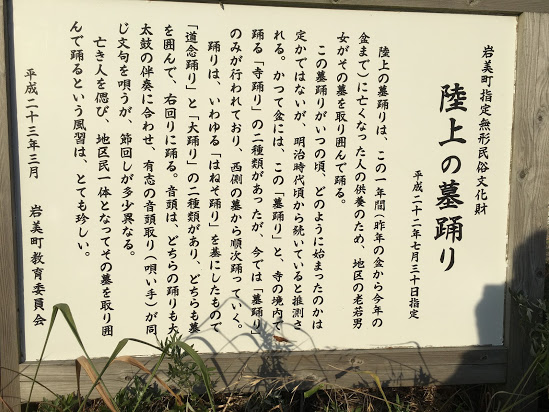 「陸上の墓踊り」は先祖供養のための盆踊りです。新盆の家のお墓を順番に巡って、地域の人でお墓を囲んで踊ります。