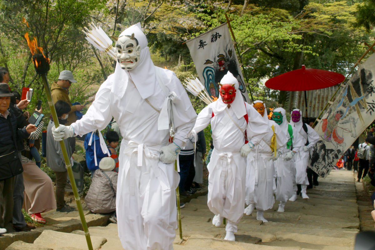 ついに現れました。白馬に乗った赤鬼の姿は異様な光景に移ります。かつて白馬に乗って現れたマダラ鬼神が、戦国時代の戦火で焼け落ちた楽法寺の再建の際に一躍かったという故事を再現しての登場です。静かに、そして神々しく白馬は石段を上へ上へと進みます。