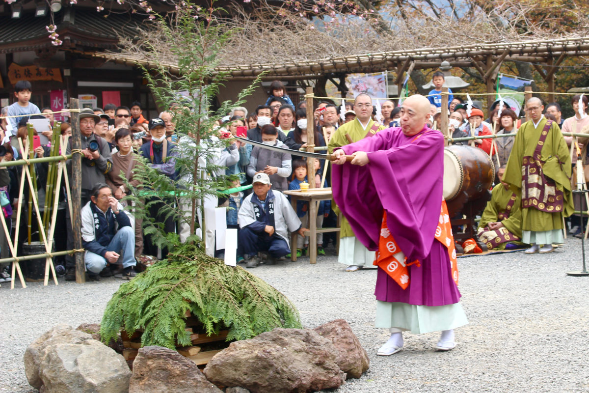 境内の真中にお焚き場が用意され、住職による儀式がはじまります。住職に刀が用意されました。魔を断ち切るのか、何度も一刀両断が行われます。