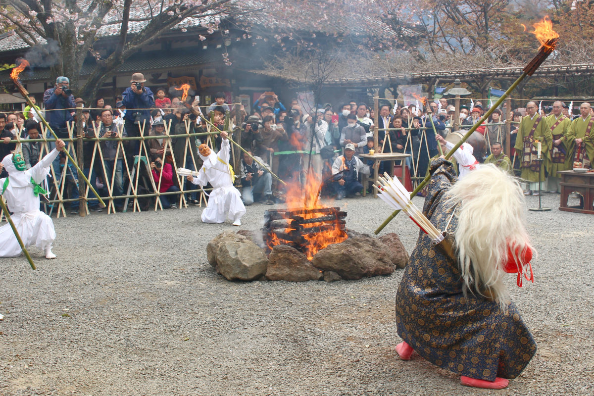 いよいよ火がつけられました!住職による儀式が続きます。火が激しくなるとともに、マダラ鬼神を先頭に鬼たちが境内へ登場しました!手には、杖のようなものを持っています。