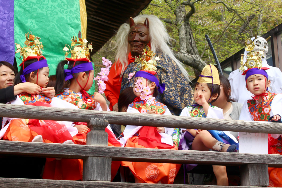 お祭りの出番が終わったマダラ鬼神が、稚児装束を着た子どもたちの所へ現れました。