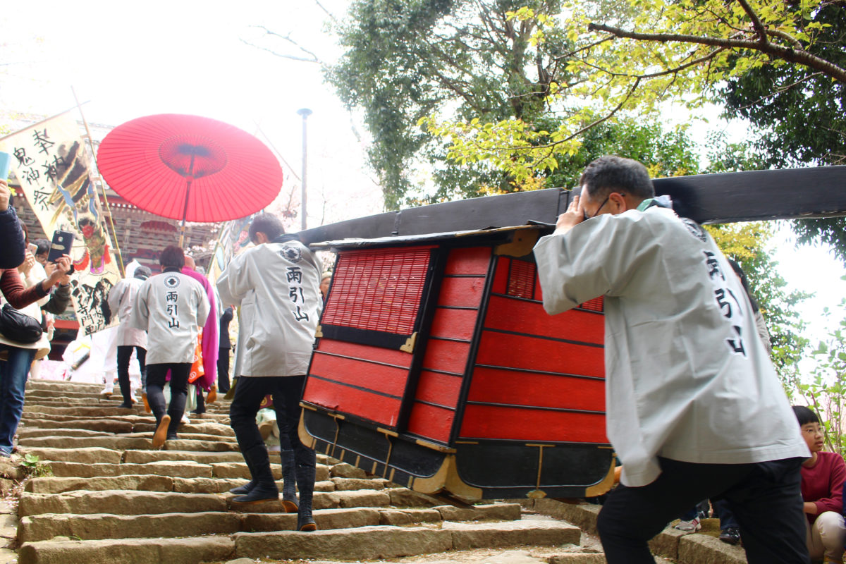 5色の鬼の後からは大名を載せた輿が続きます。このご一行が登りきると、祭りの舞台は石段から境内へと移ります!