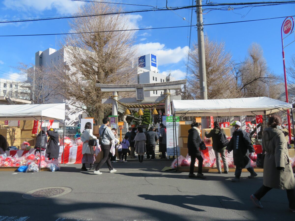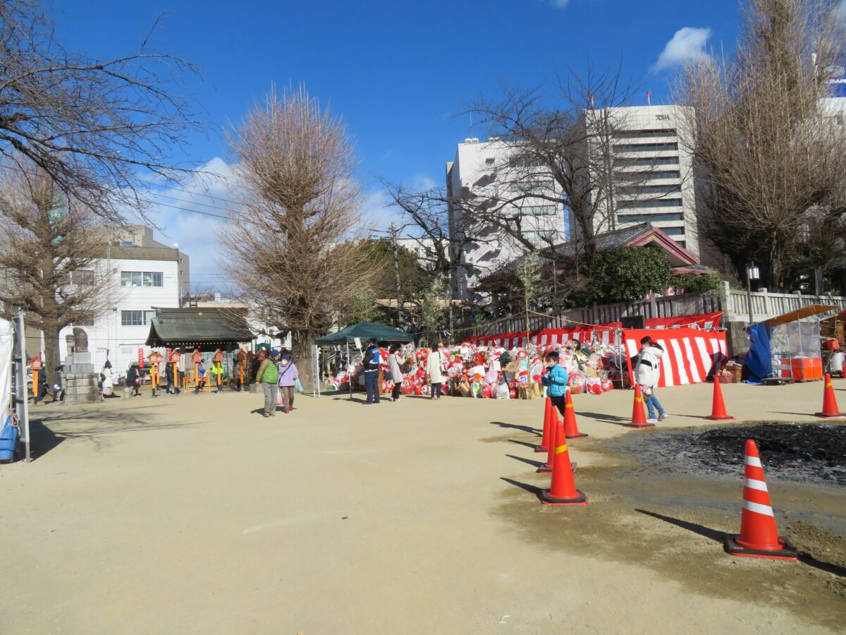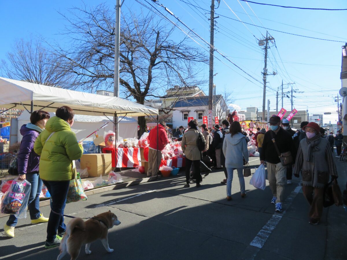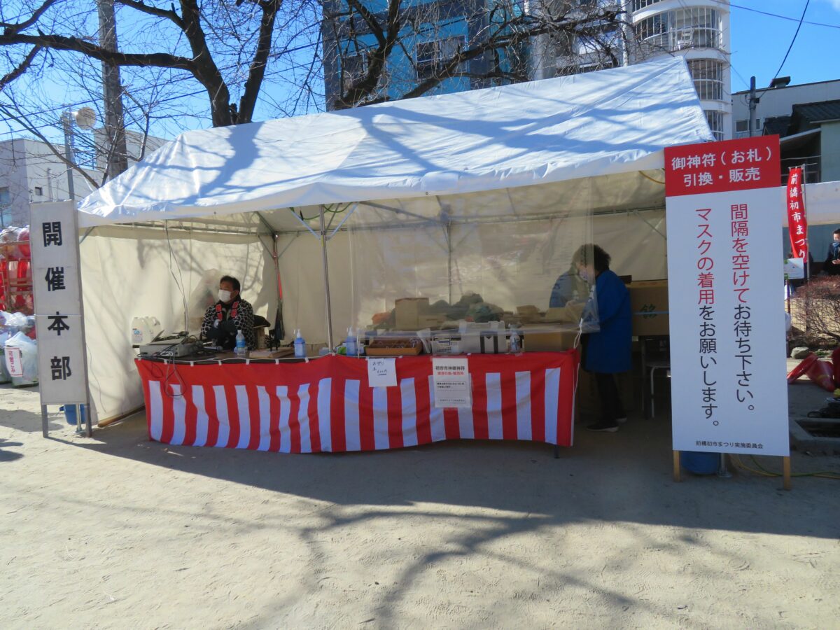 2021年の「前橋初市まつり」は新型コロナウイルス感染防止のため、規模が大幅に縮小されました。神輿の「渡御の儀」は中止、古だるまの納所は設けられるものの「お焚き上げ」の一般公開は行われませんでした。例年であれば神社から周辺の商店街に向かって露店がひしめき合いますが、20201年は神社の境内に約10店舗並ぶのみでした。