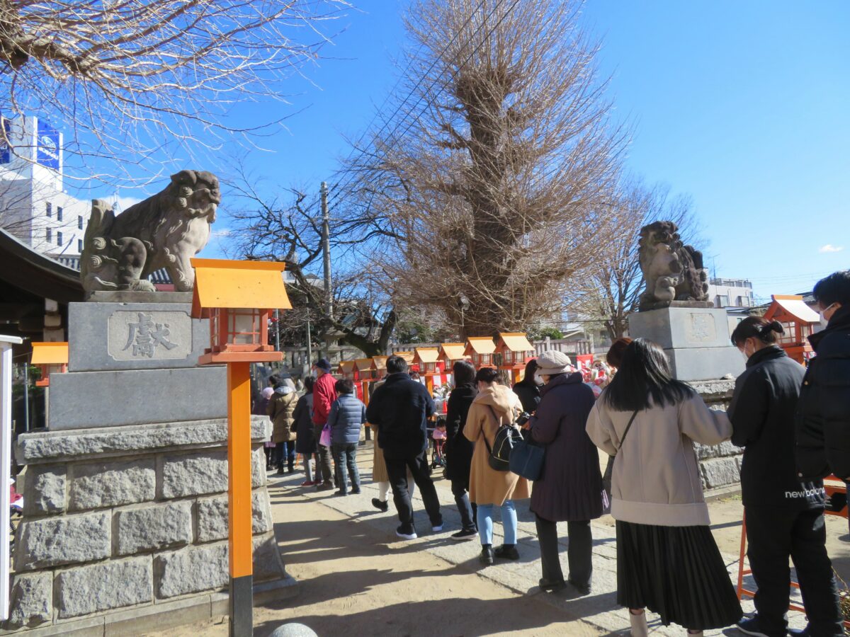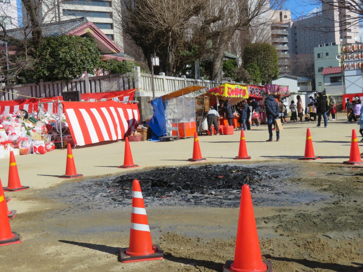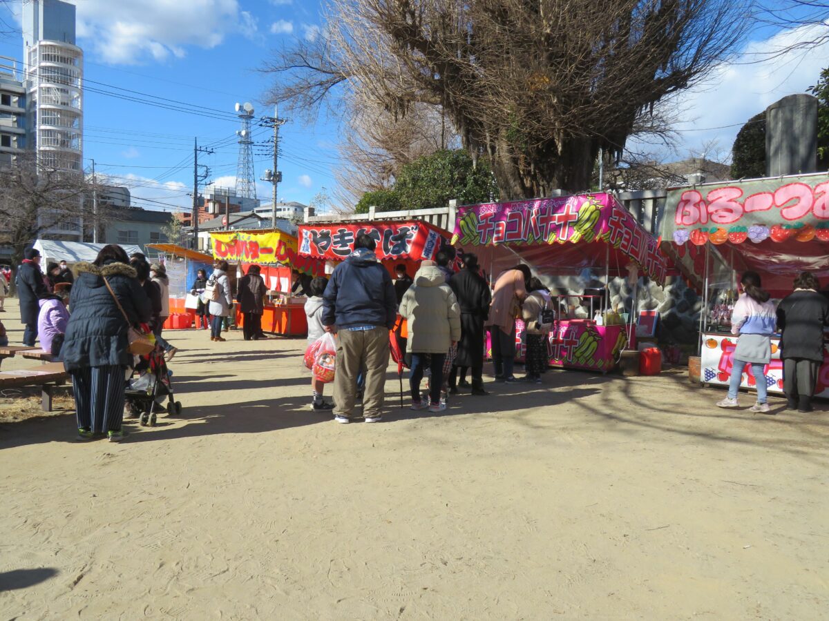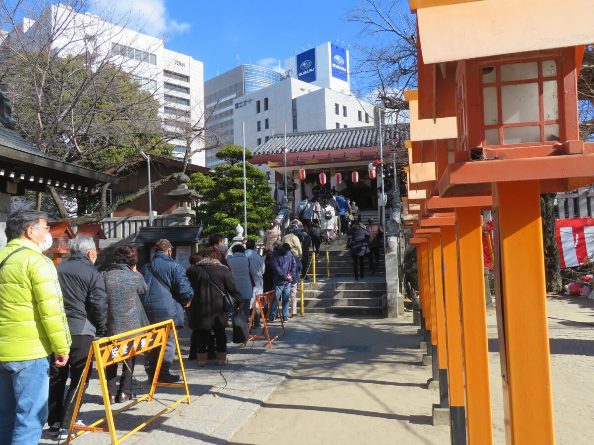 2021年の「前橋初市まつり」は新型コロナウイルス感染防止のため、規模が大幅に縮小されました。神輿の「渡御の儀」は中止、古だるまの納所は設けられるものの「お焚き上げ」の一般公開は行われませんでした。例年であれば神社から周辺の商店街に向かって露店がひしめき合いますが、20201年は神社の境内に約10店舗並ぶのみでした。