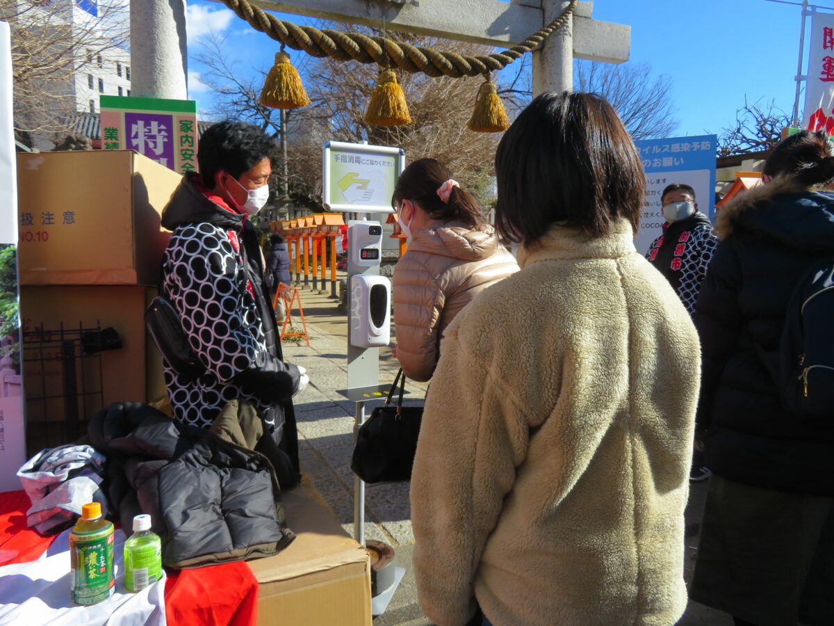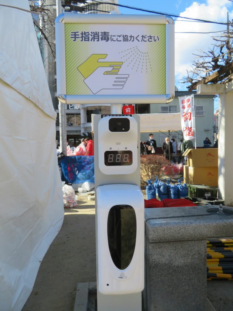神社の境内に設置された開催本部からは定期的に、新型コロナウイルス感染防止のためのアナウンスが行われ、鳥居他の出入口には、検温と消毒スプレーが1台でできる器具が設けられていました。