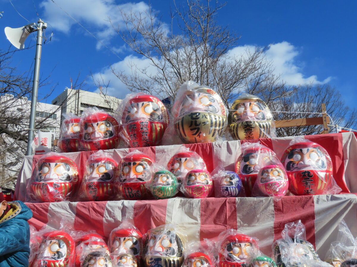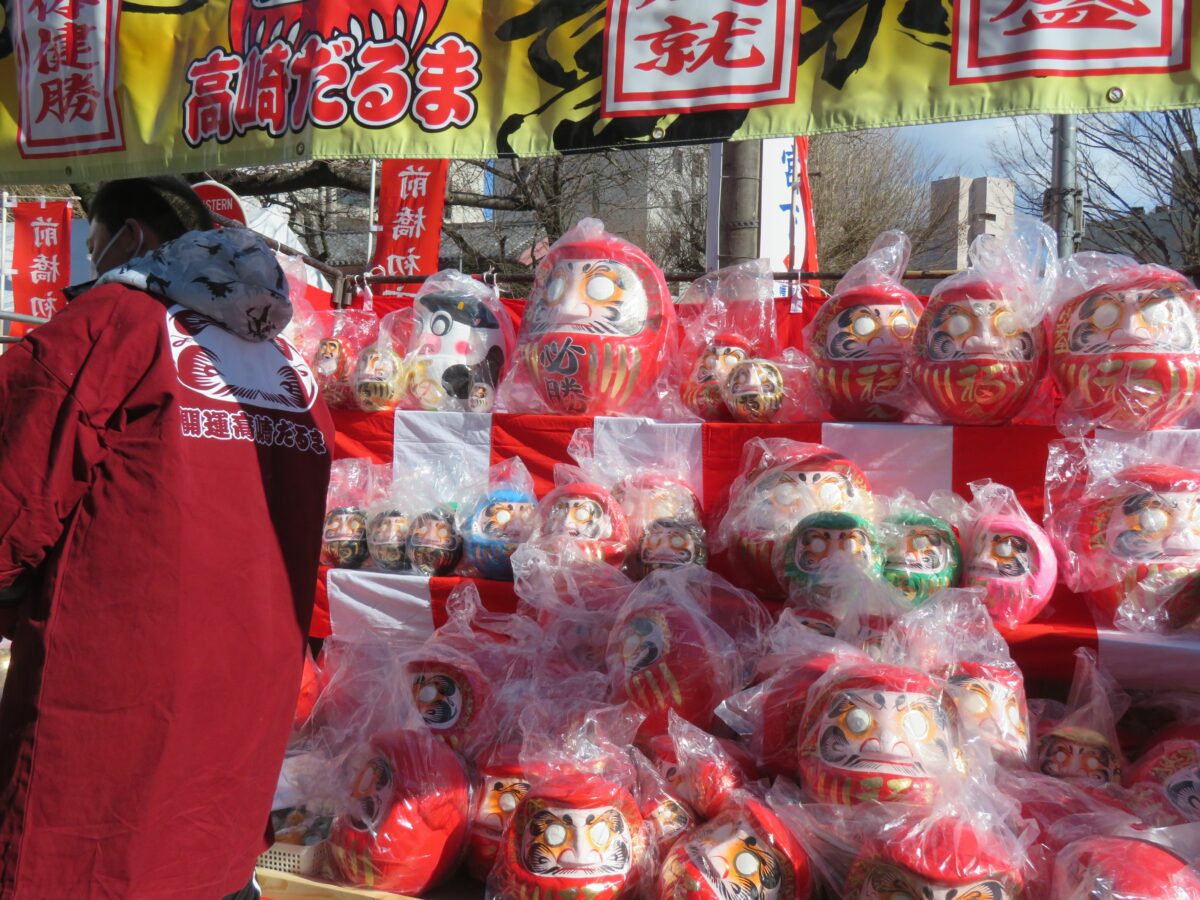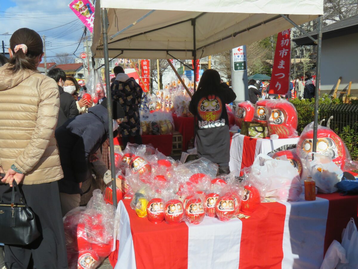 だるまは縁起物として古くから多くの人に愛されています。新年には全国各地でだるま市が開催されています。日本で最も多くのだるまが生産されている群馬県高崎市に接する前橋市では、毎年1月9日に前橋八幡宮を中心として「前橋初市まつり」が開催されています。2021年は新型コロナウイルス感染防止のため、規模を大幅に縮小して実施されました。