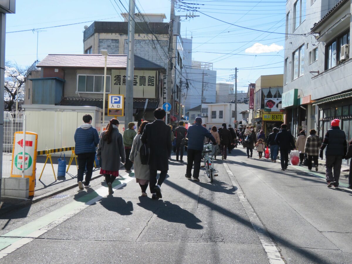 国道50号線の本町2丁目交差点から前橋八幡宮に向かう人々