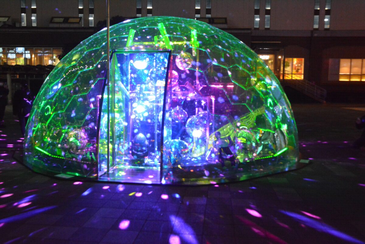 南口広場の中央で眩しい光を放射するのは、ブリリアンドームです。時間とともに彩りを変化させる球形のドームからは、希望や力強さが滲み出してくるようです。