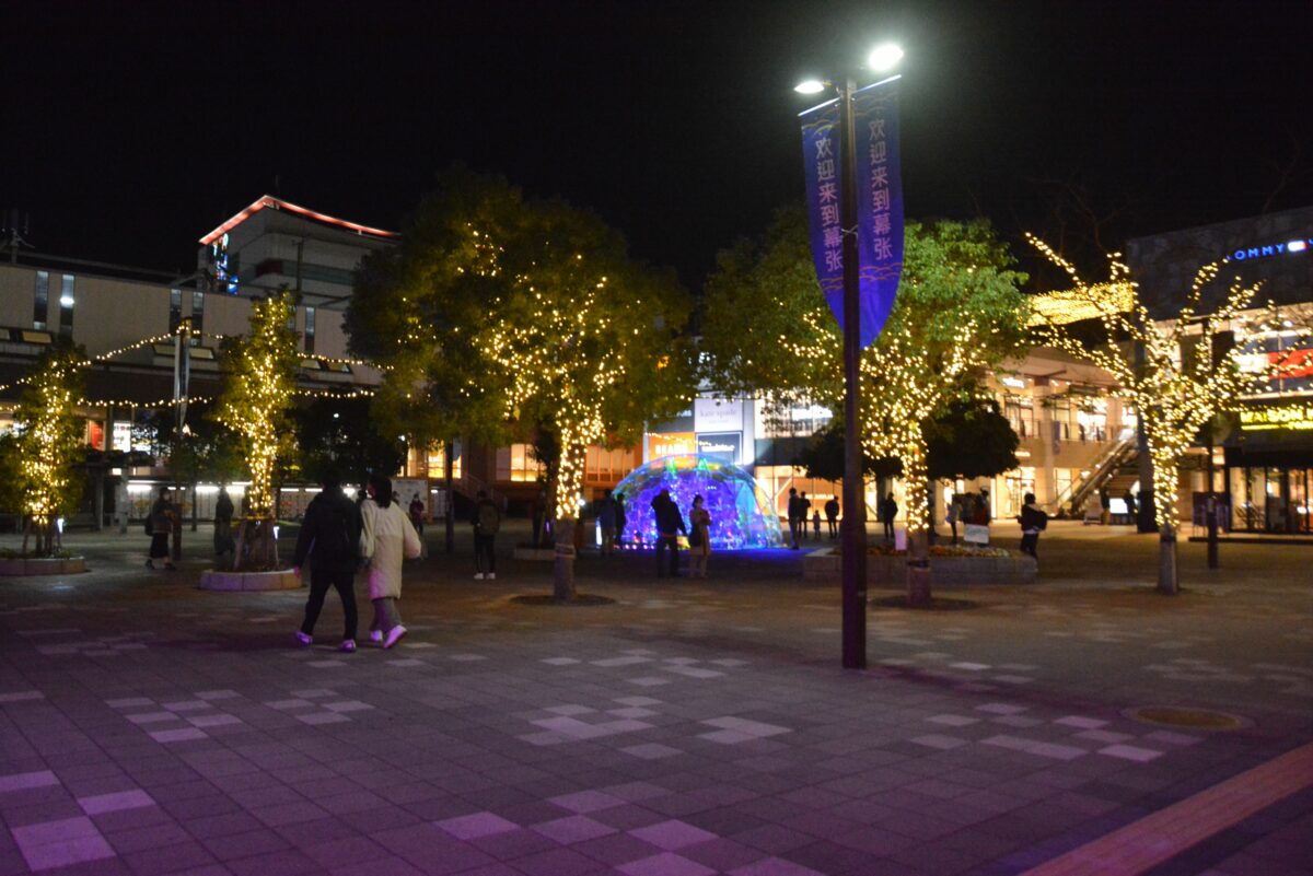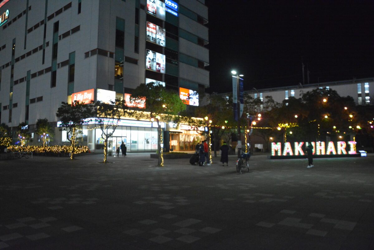北口の広場を囲む樹木は、夢、未来、創造をイメージするミラクルキューブで照らされます。広場の中央に設置された「MAKUHARI」の文字のオブジェにはカメラを持った人々が集まり、人気のスポットとなっているようです。東の駐輪場も鮮やかなイルミネーションで輝きます。
