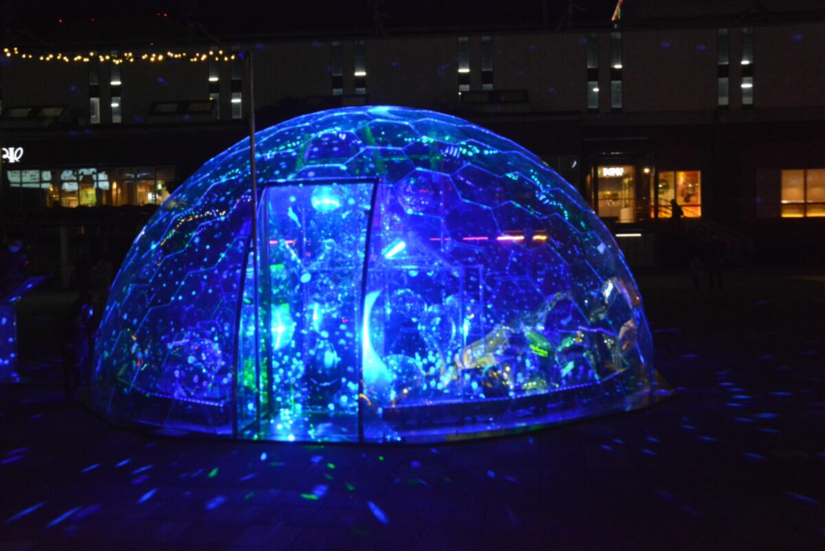時間とともに彩りを変化させる南口のビビッドルーフやブリリアンドーム