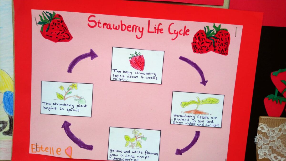 さらに進むと小学校があって、その外側に子供たちが作成したイチゴに関する絵などの作品がびっしり展示されています。中には実際にイチゴを栽培した様子の写真と絵を組み合わせているものもあり、この小学校ではイチゴ栽培体験を授業に取り入れていることがわかりました。