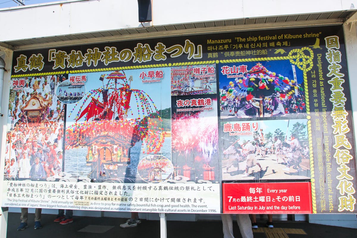 真鶴駅前に掲げられている、お祭りを紹介するボード。この一枚だけでもたくさんの魅力があるお祭りだと伝わってきます。
