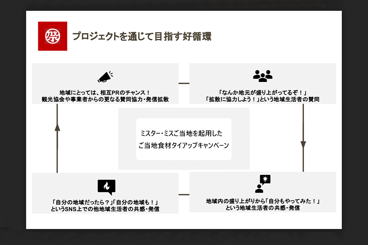 どの地域にも、その地域の観光PRを行うことを目的に「ご当地ミス」や「観光大使」といった人たちがいます。地域の顔として活動する方とタイアップすることで、地域住民の共感を引き出し、「地元を応援したい!」という気持ちを購買につなげることが出来ると考えています。