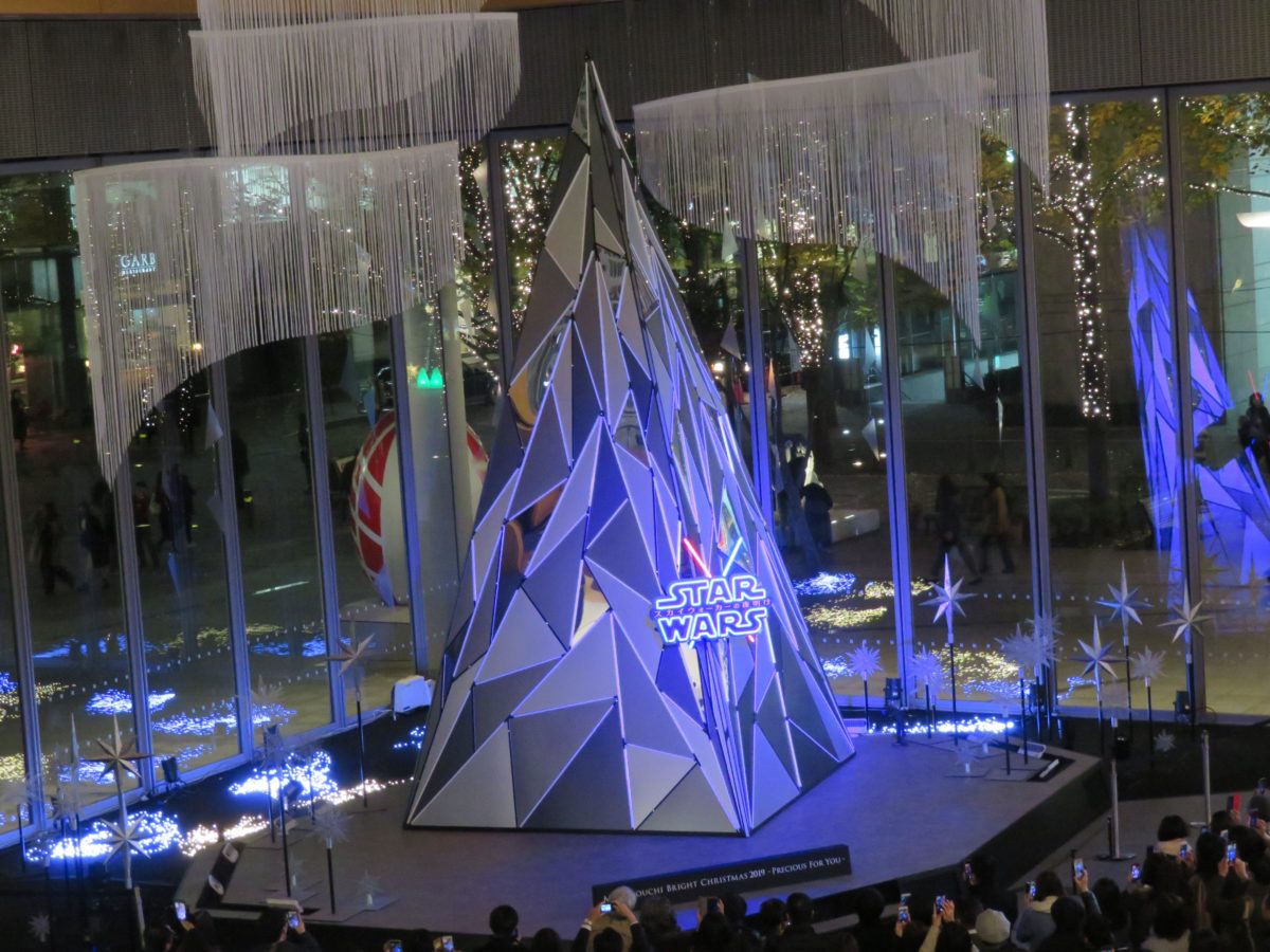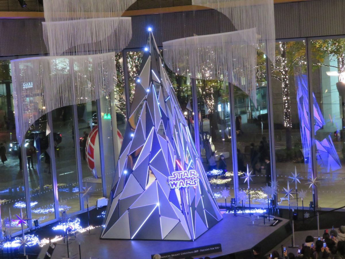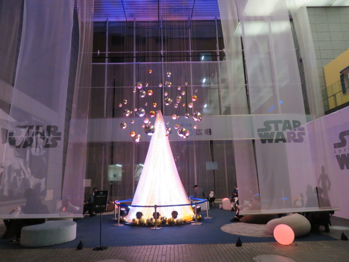 丸の内オアゾの〇〇広場に設置されたクリスマスツリーは、シンプルな形状をしていますが、周囲には光を放つ球体が取り囲んでいます。これは「スター・ウォーズ/最後のジェダイ」に登場したオク=トーをイメージした空間のようです。