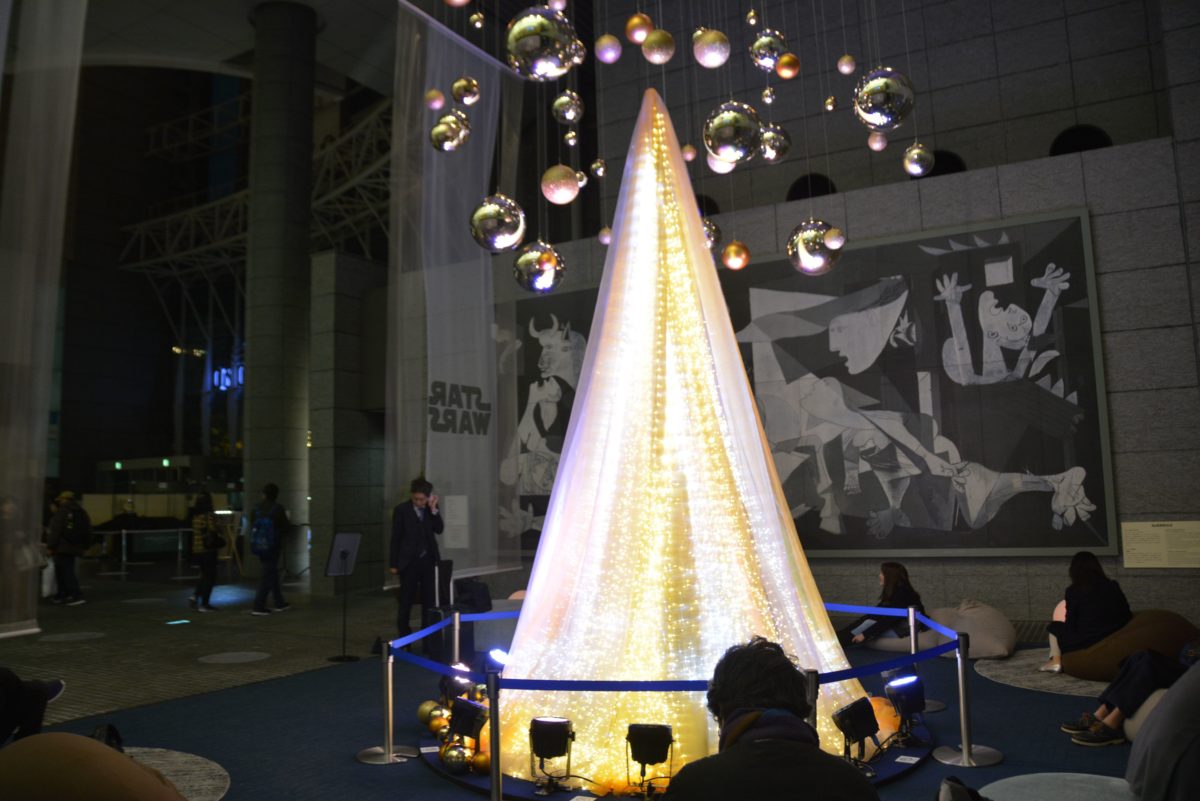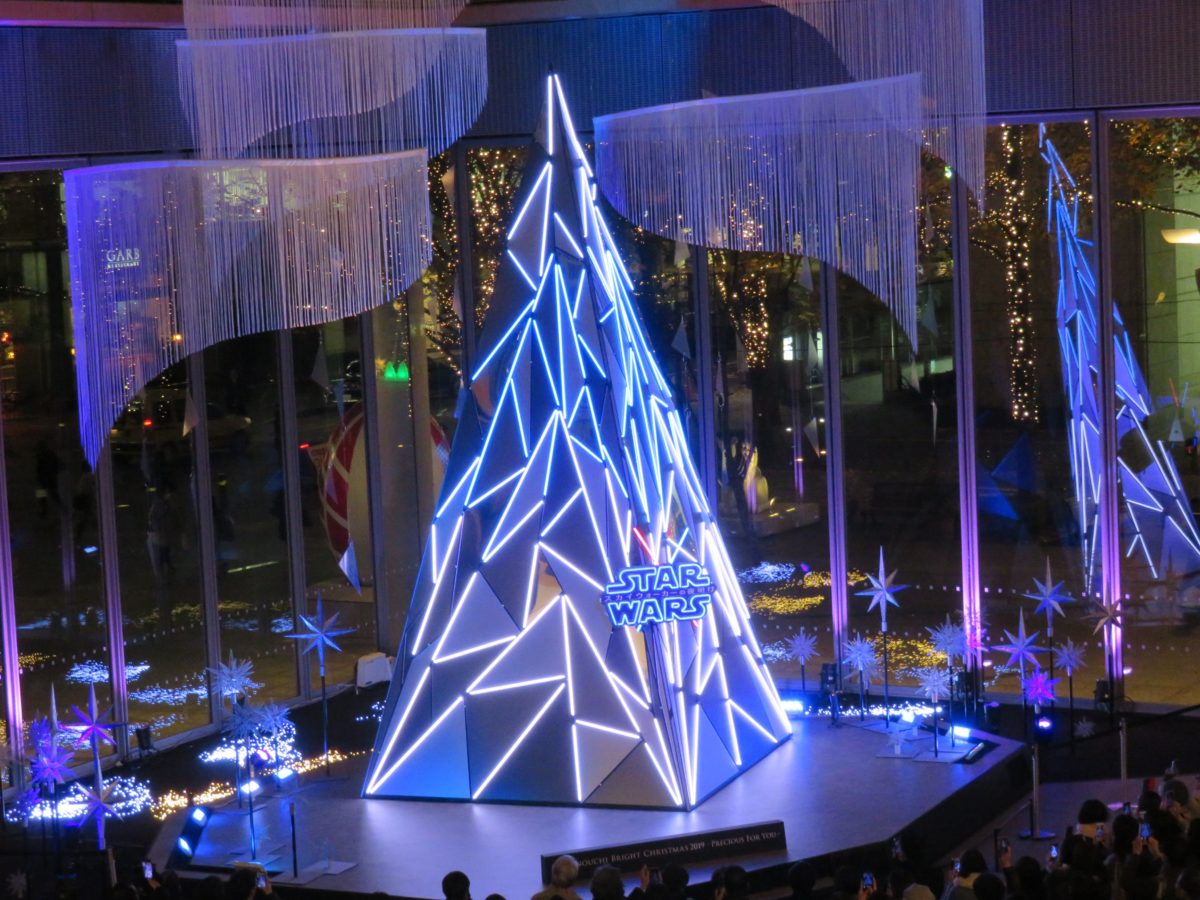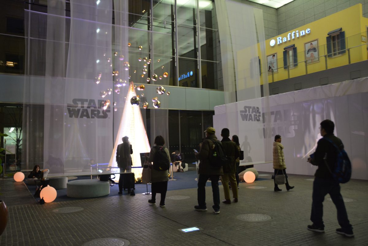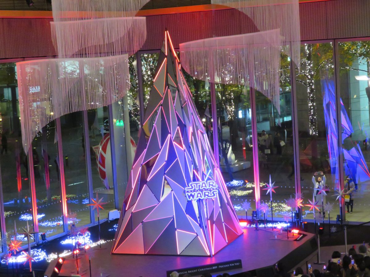 丸の内オアゾの〇〇広場に設置されたクリスマスツリーは、シンプルな形状をしていますが、周囲には光を放つ球体が取り囲んでいます。これは「スター・ウォーズ/最後のジェダイ」に登場したオク=トーをイメージした空間のようです。