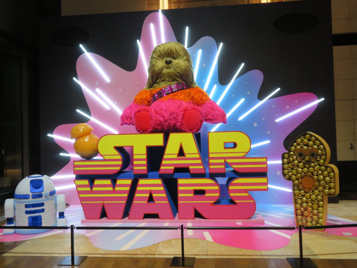 新丸ビル3階のアトリウムには、チューバッカ、C-3PO、R2-D2、BB-8などの「スター・ウォーズ」のキャラクターが現れます。ピンクを基調としたカラフルな色彩は、きっと写真映えすることでしょう。