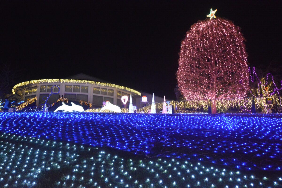 光の絨毯には、サンタクロース、エンジェル、トナカイに加え、幾何学的なオブジェが設置され、彩りにアクセントが添えられています。イルカは青色の海原を飛び跳ねているかのようです。