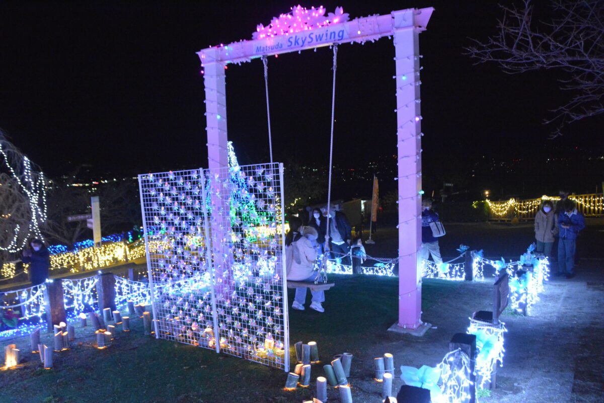園内には趣向を凝らしたフォトスポットがちりばめられていますが、最も目を引くのがブランコの「スカイスウィング」です。イルミネーションで包まれるブランコを漕げば、光がアクティブに動き出します。