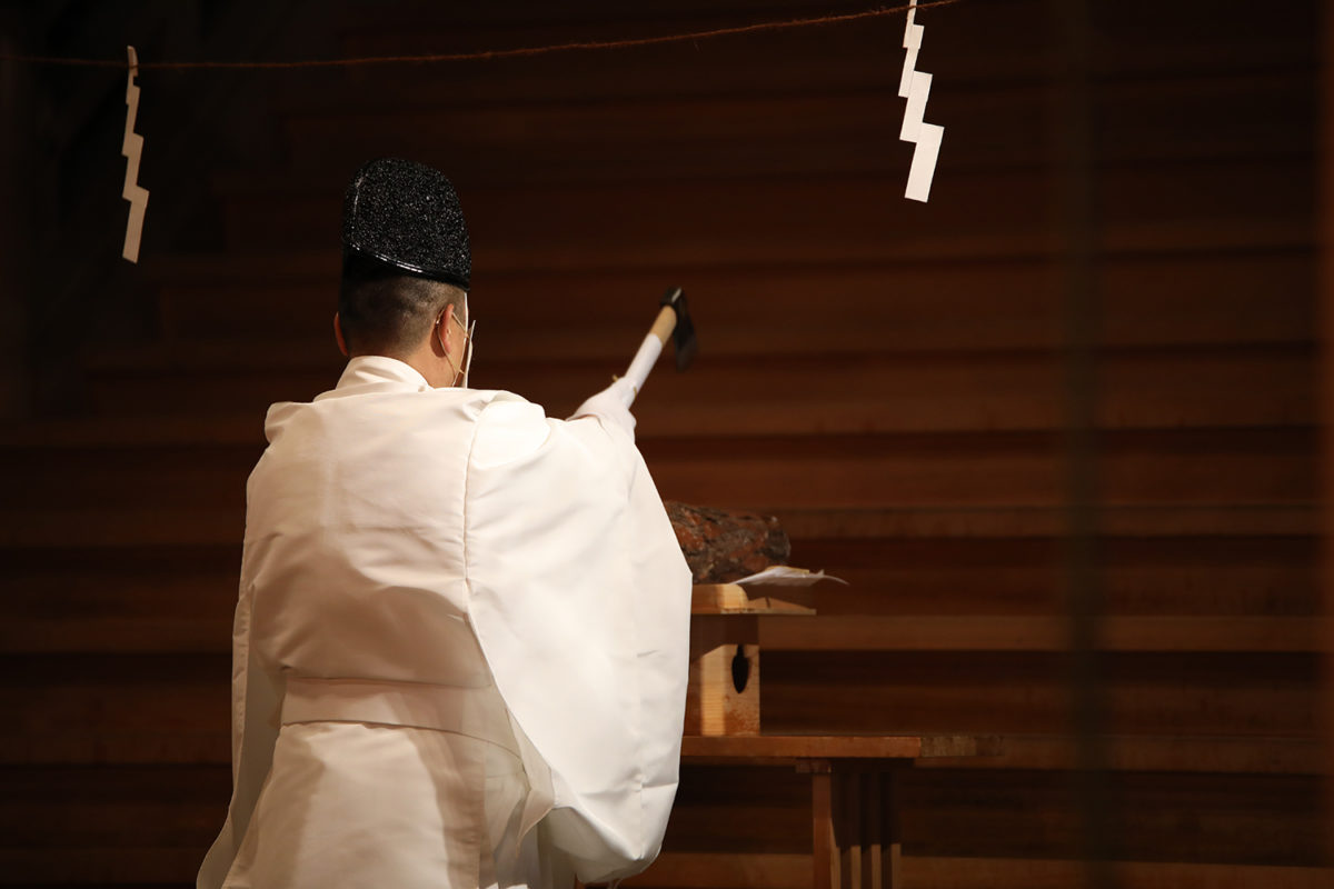 1月17日の牛王宝印神事で使われる聖なる松に斧が入れられます。