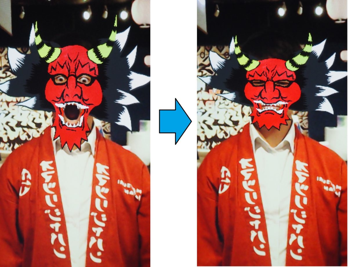 こちらの展示では顔認証の技術を駆使し、モニターに映った自分の顔にねぷたのお面を装着することが出来る様になっています。ふつうのお面と違うのは、顔の表情を変えると、お面も変化に対応してくれること。