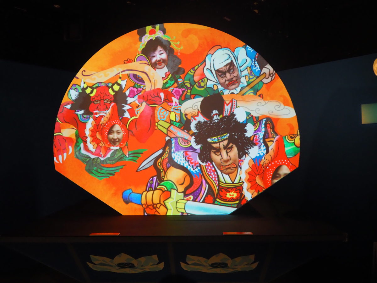 続いてご紹介するのは「山車ねぷた」!ねぷたはもともと和紙で作られていますが、こちらのねぷたはプロジェクションマッピングの技術を利用しています。描かれた絵が動くだけでもすごいのですが…実は先ほどのねぷたがおやで変身した顔がリアルタイムで投影されるんです!