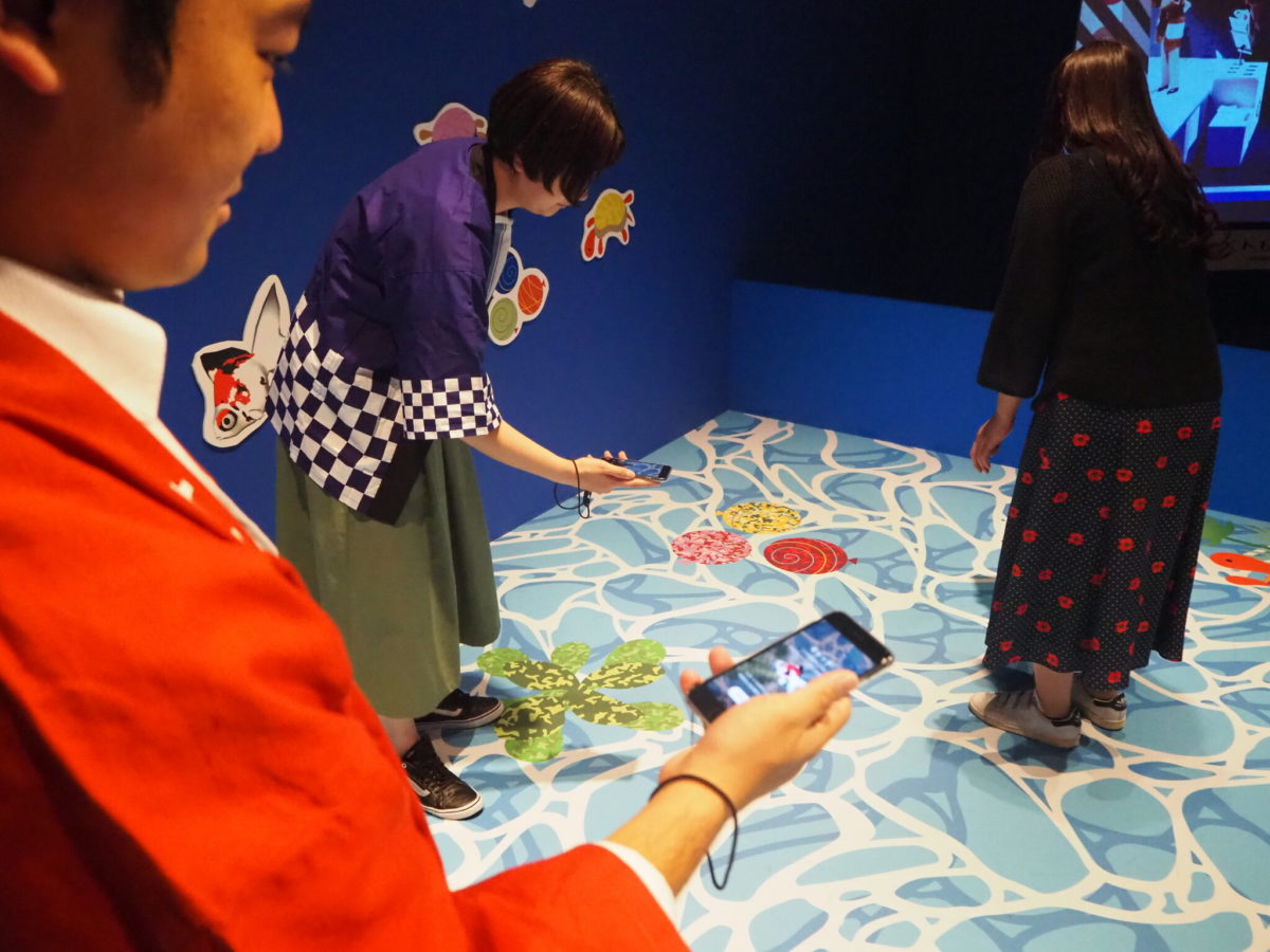 最後にご紹介するのは、お祭り縁日の定番金魚すくい!バーチャルな金魚すくいを楽しむことができます。タモに見立てたスマホを手に持ち、画面に投影される映像を見ながら、実際に手を動かして金魚をすくっていきます。