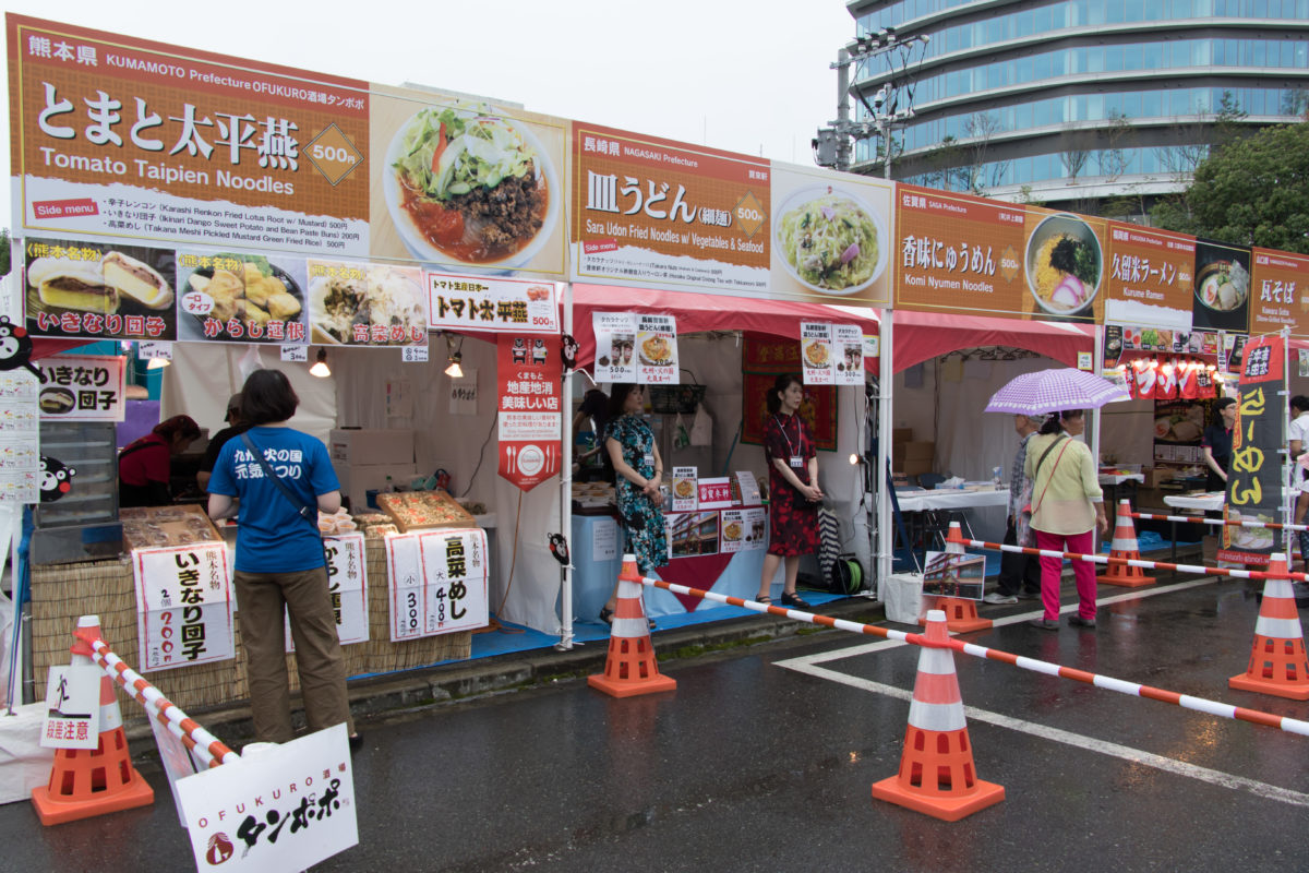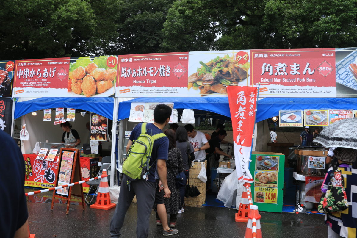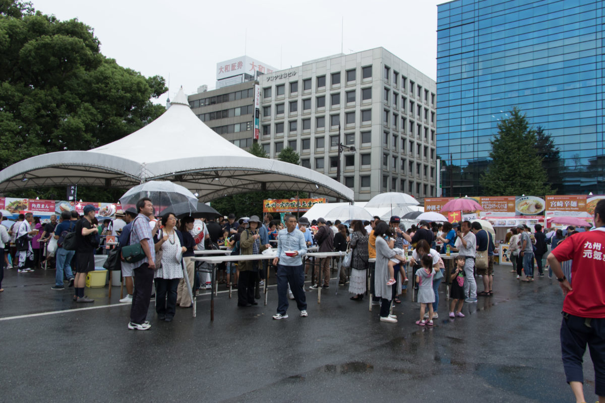 あいにくのお天気ではありましたが、訪れた人々は「牛串」「中津からあげ」「久留米ラーメン」、さらには山口県の「瓦そば」、長崎県の「角煮まん」などのご当地グルメを楽しんでいました。