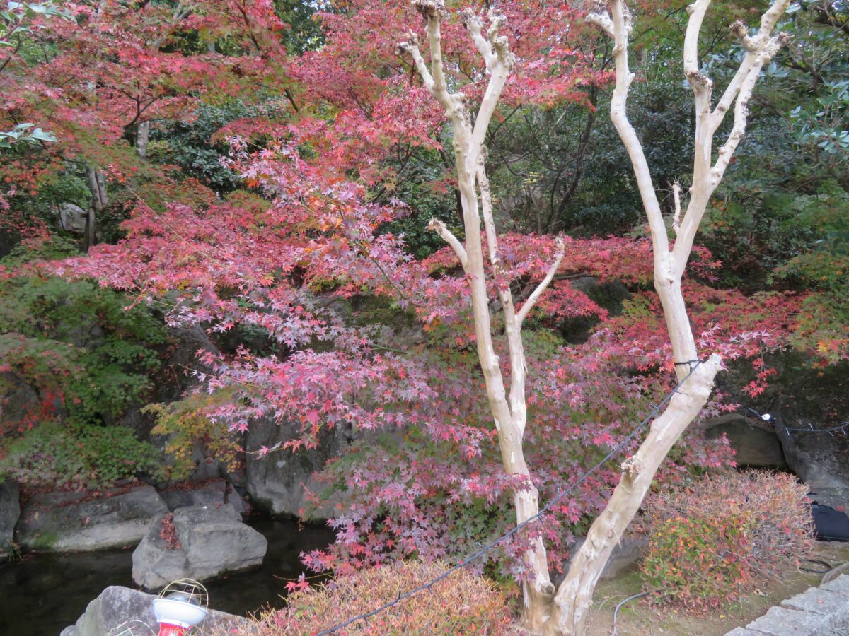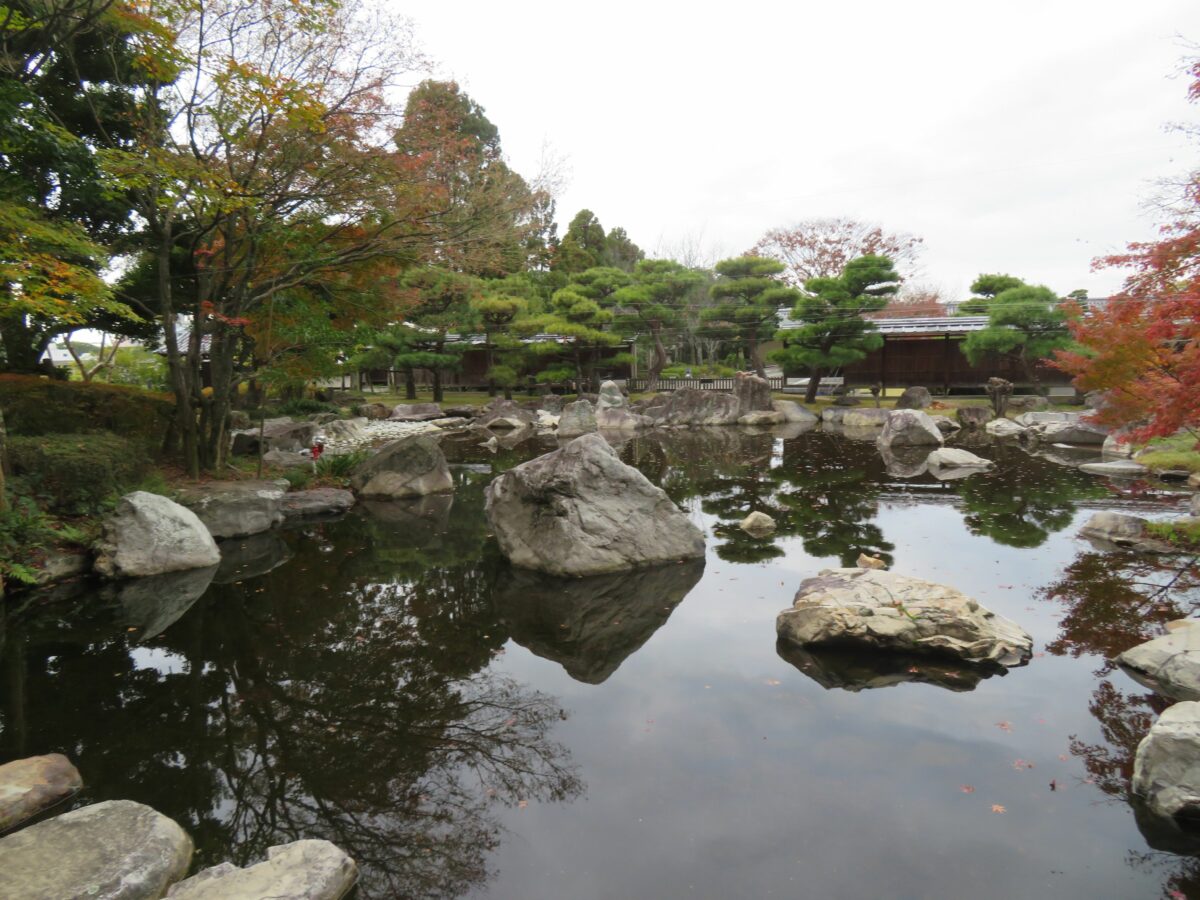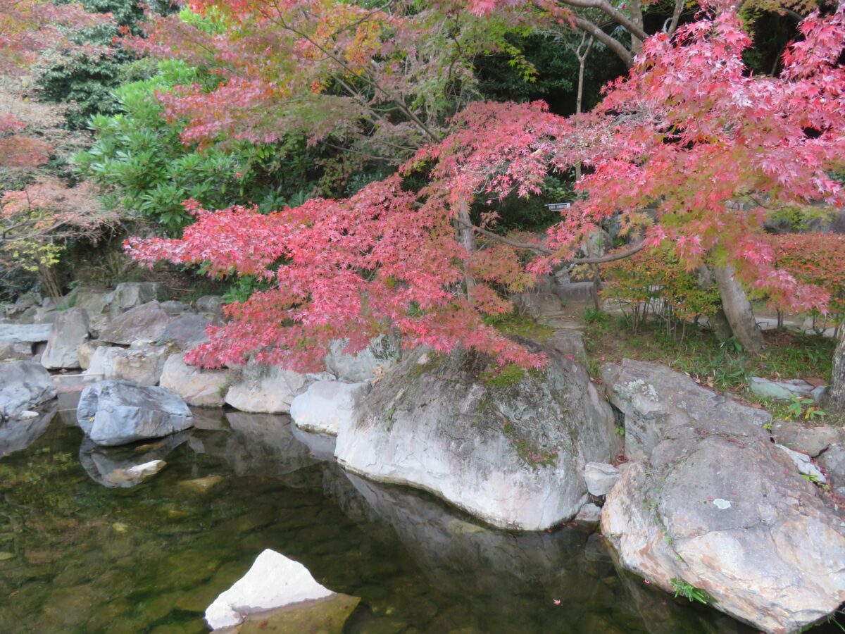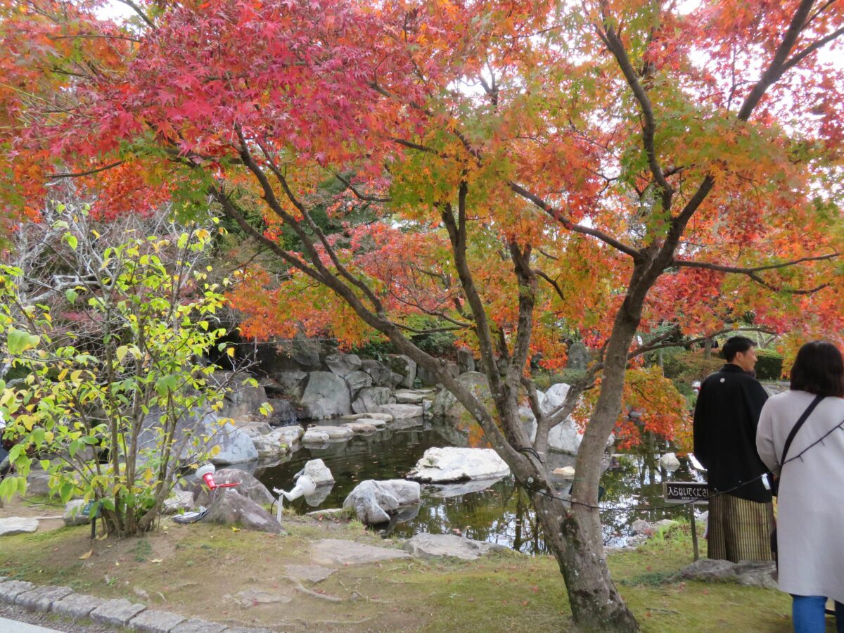 聚楽亭から水路に沿って東に向かうと林泉庭です。和の情緒が漂う池の周りは、ヤマモミジやケヤキで囲まれ、例年11月中旬から下旬には紅葉で覆い尽くされます。