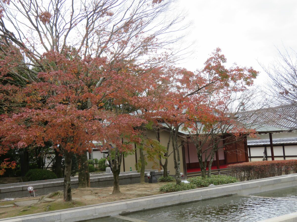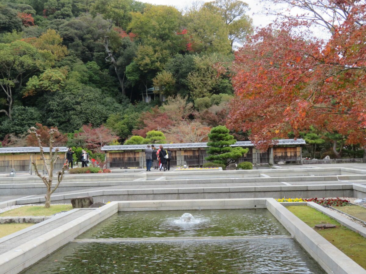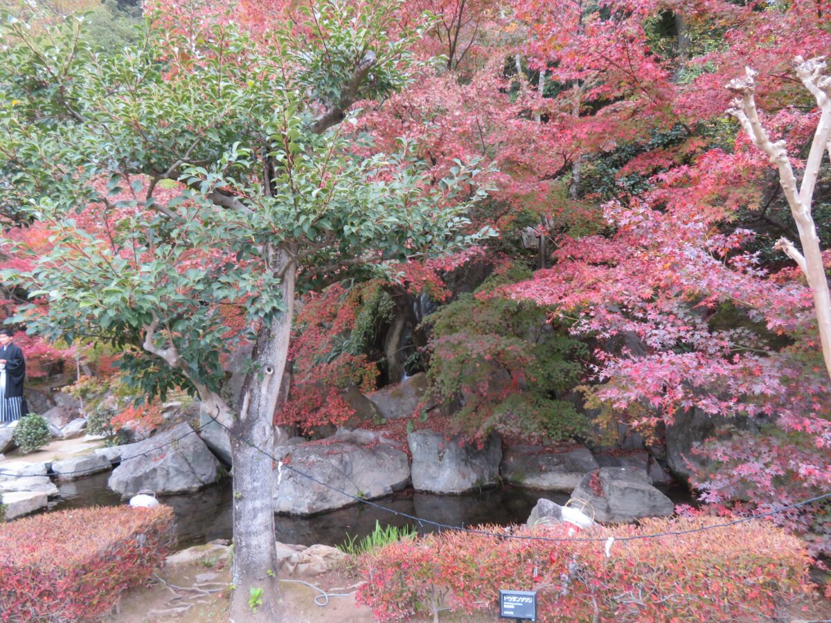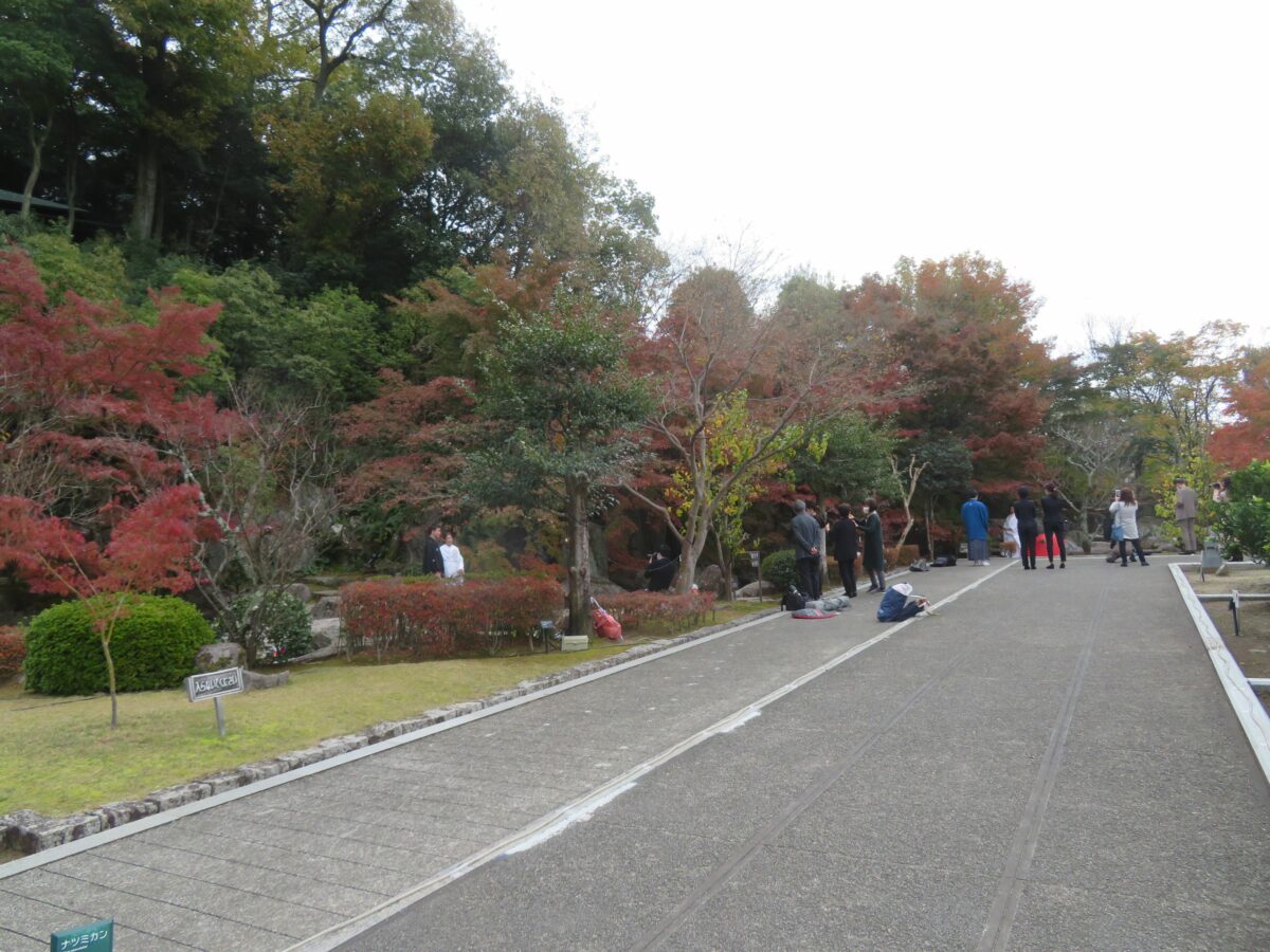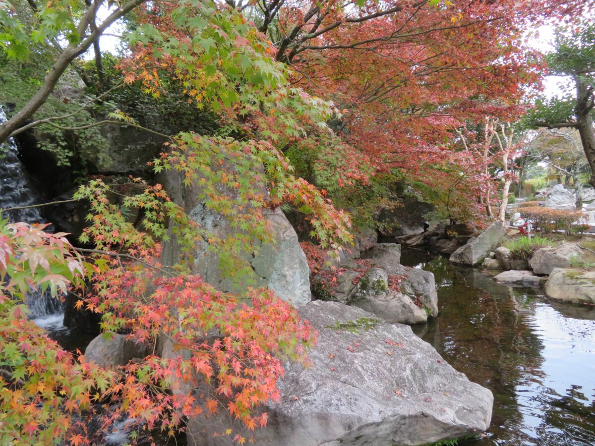 聚楽亭から水路に沿って東に向かうと林泉庭です。和の情緒が漂う池の周りは、ヤマモミジやケヤキで囲まれ、例年11月中旬から下旬には紅葉で覆い尽くされます。