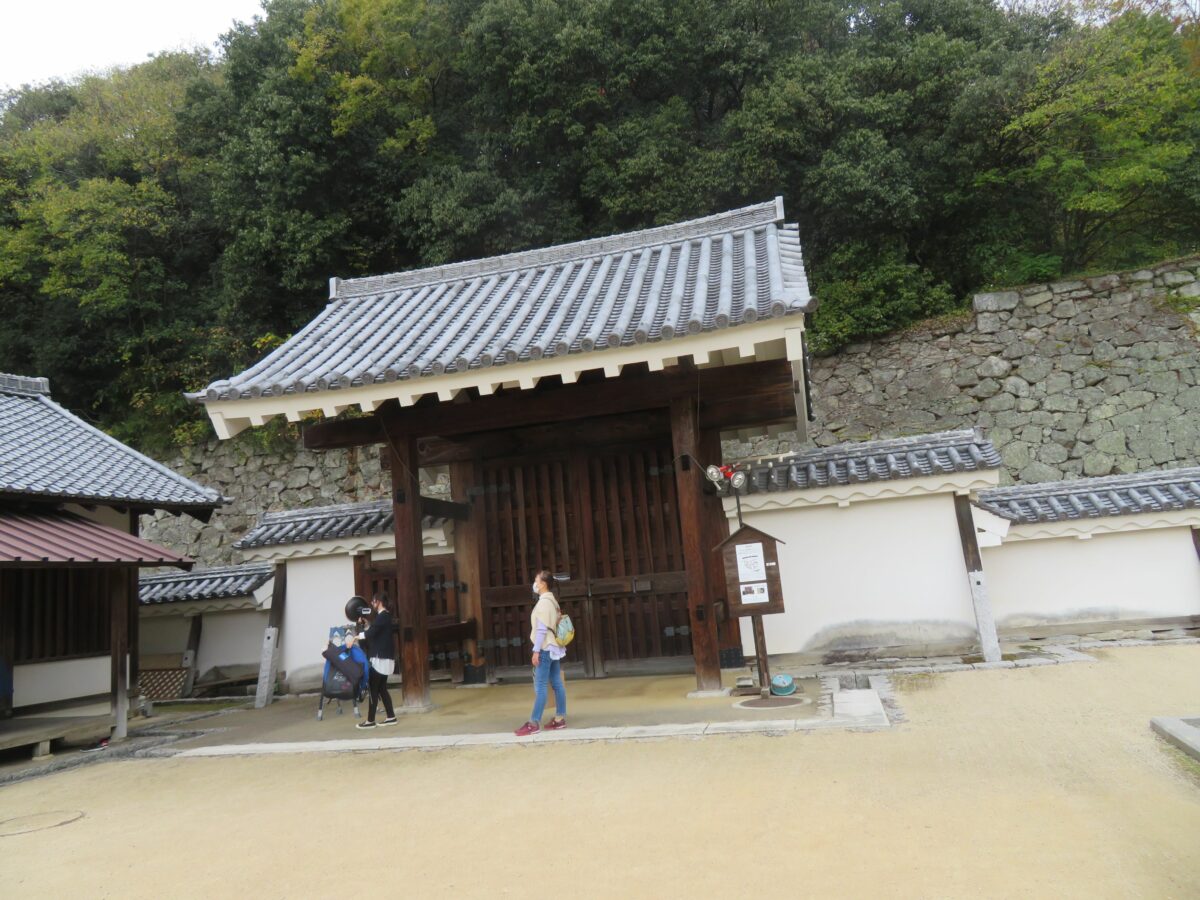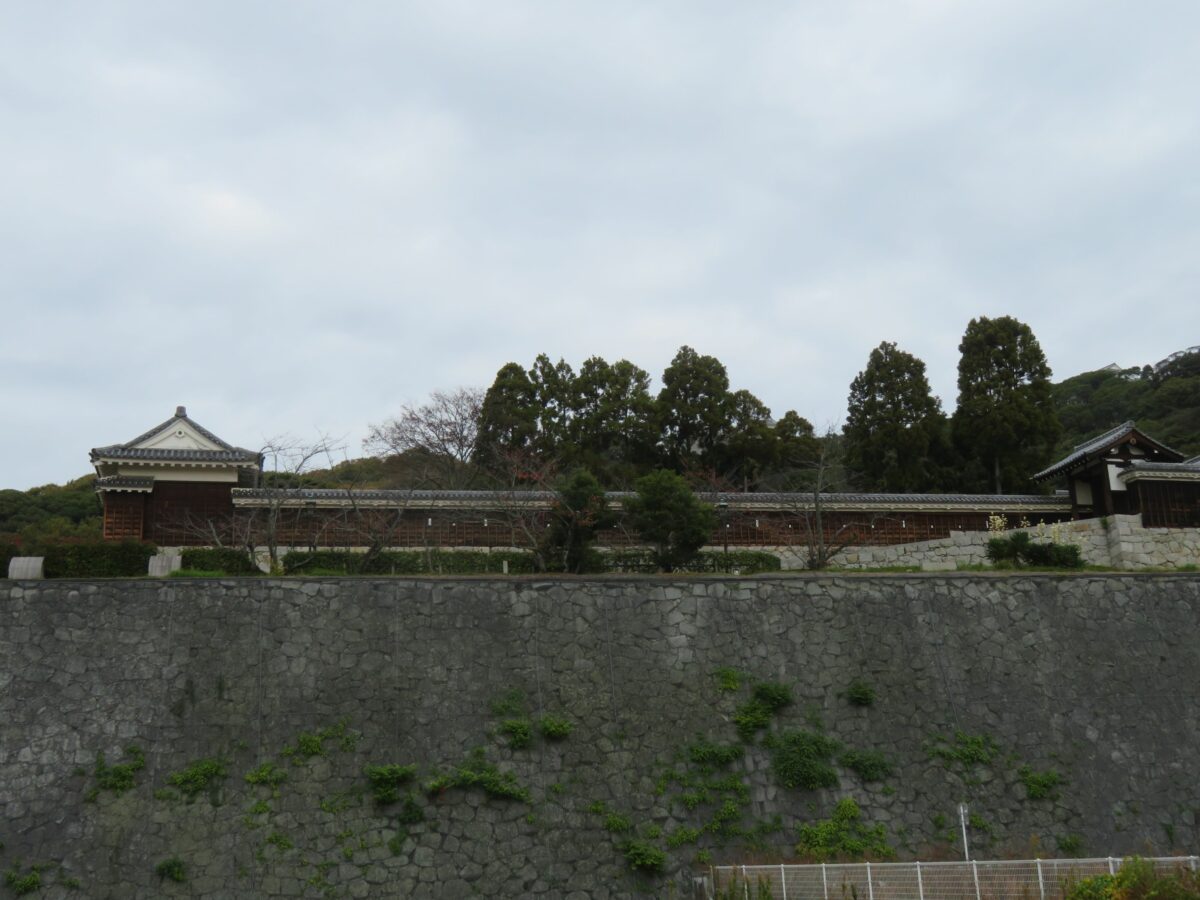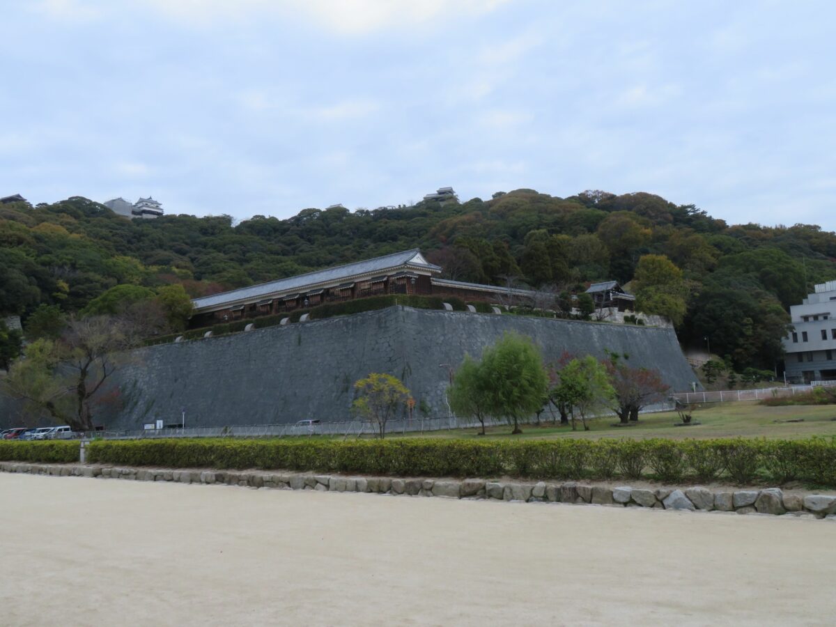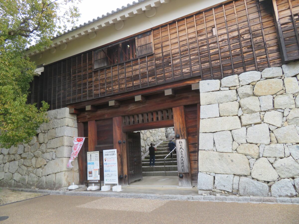 松山城の二之丸には、藩の中枢機能を果たす表御殿と、藩主の家族が暮らした奥御殿が設けられていました。本丸に向かう北側の四脚御門を公式の門とし、西側の多聞櫓の門は通用口とされていました。現在の庭園の出入口は城山公園に接する多聞櫓に設けられています。