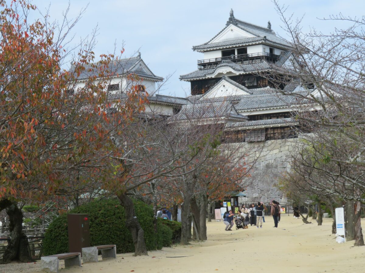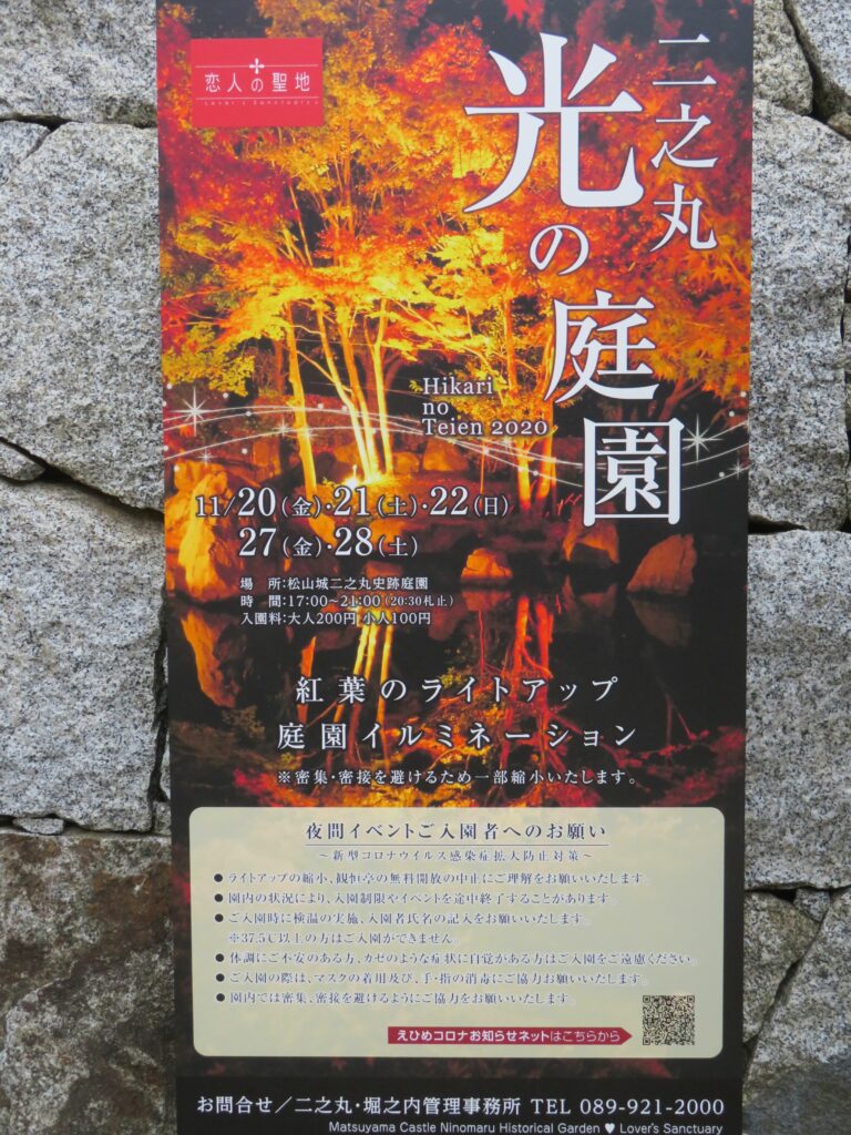 日本の各地には城を中心として発展した都市が数多くあります。江戸時代には国内に200近くの城が存在しましたが、明治時代以降に次々に失われ現在、天守が残っているのは12しかありません。愛媛県松山市の中心に聳え立つ松山城の天守は、現存12天守の一つです。標高約130メートルの勝山の中に、櫓や門など21棟の建造物が残されています。本丸を見上げる二之丸跡は、二之丸史跡庭園が整備されています。園内は例年11月中旬から下旬にかけて紅葉で彩られます。2020年には11月20、21、22、27、28日の5日間、「二之丸光の庭園」が開催され、夜間のライトアップが行われました。