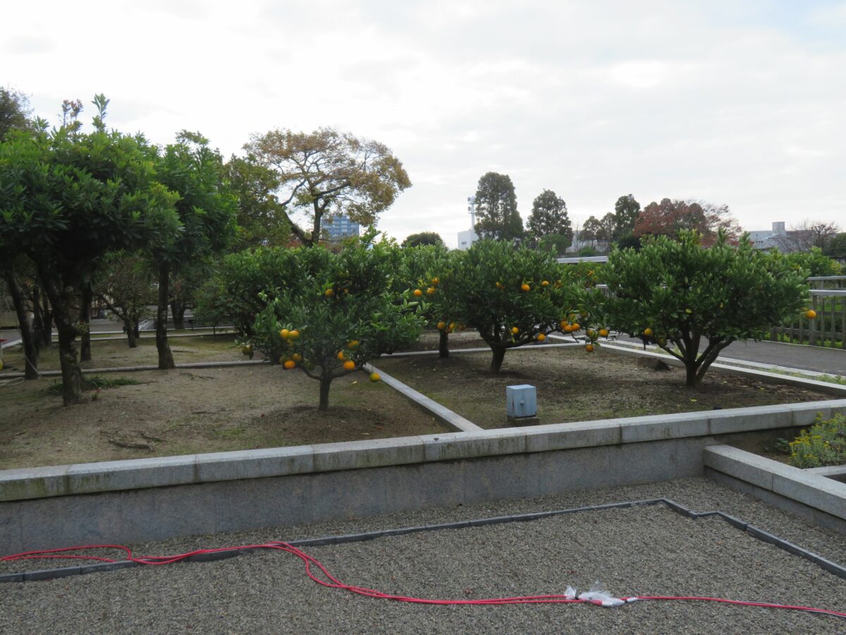 江戸時代に建ち並んでいた御居間や大書院の建物は失われていますが、当時の間取りを偲ばせるように柑橘園が作られ、温暖な瀬戸内海地方によく育つ様々な柑橘類が栽培されています。