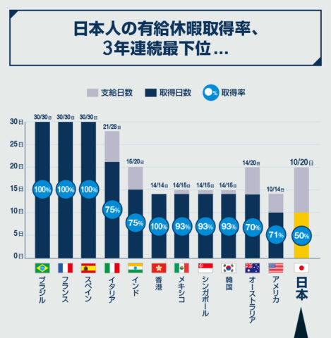 世界最大級の総合旅行サイト、エクスペディアの調査によると日本は20日の有給のうち平均取得日数が10日。