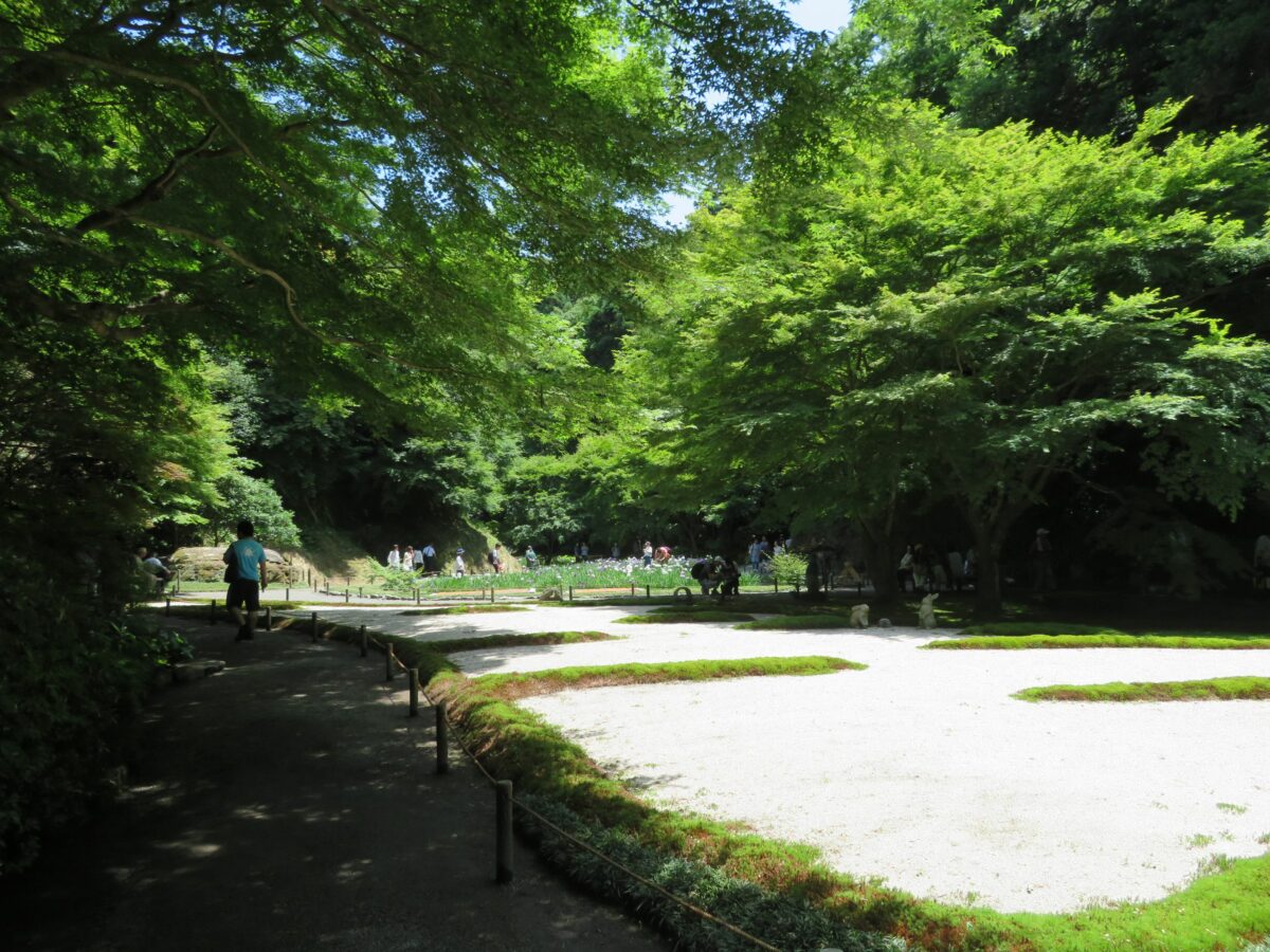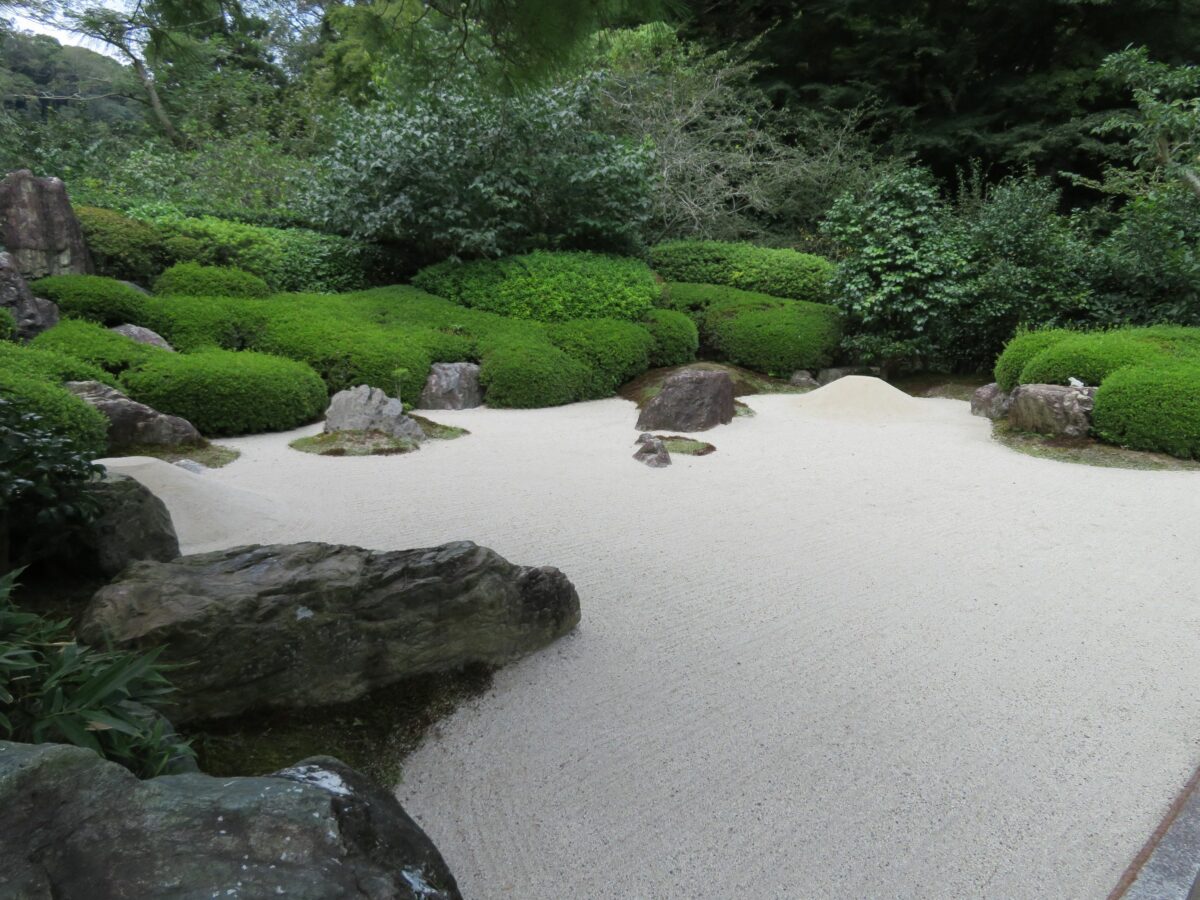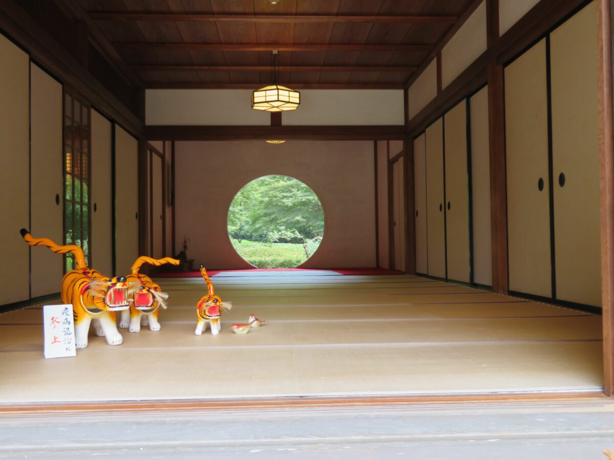 方丈の一室には丸窓が設けられた部屋が設けられています。方丈の背後には日本庭園が広がり、日本の四季の情緒が円く縁どられます。悟りの窓と呼ばれる窓の前には、カメラを手にした人々の長い行列が繋がることも珍しくありません。逆に方丈前の枯山水庭園には、一年を通して変わらぬ静寂の世界が広がります。