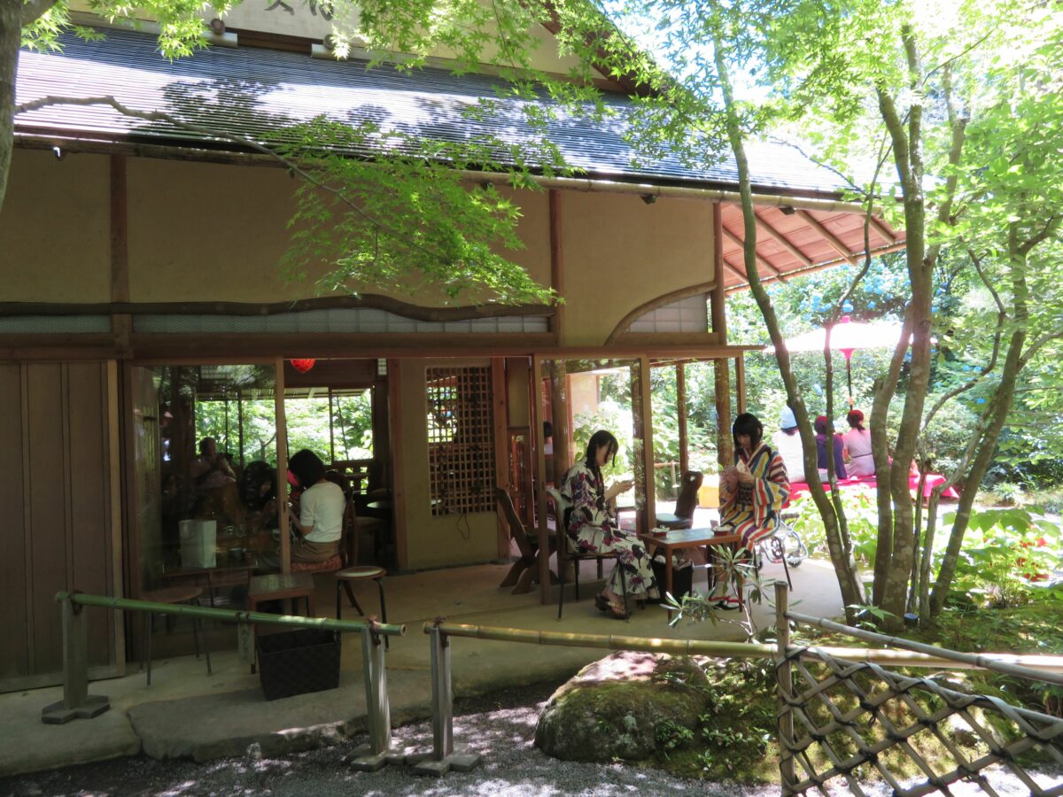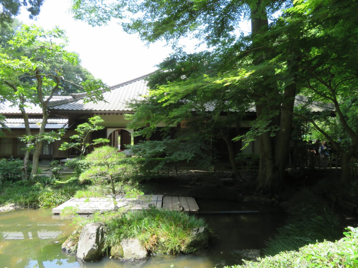 アジサイと同時期に開花する方丈背後の日本庭園の花菖蒲