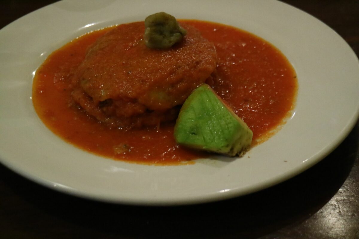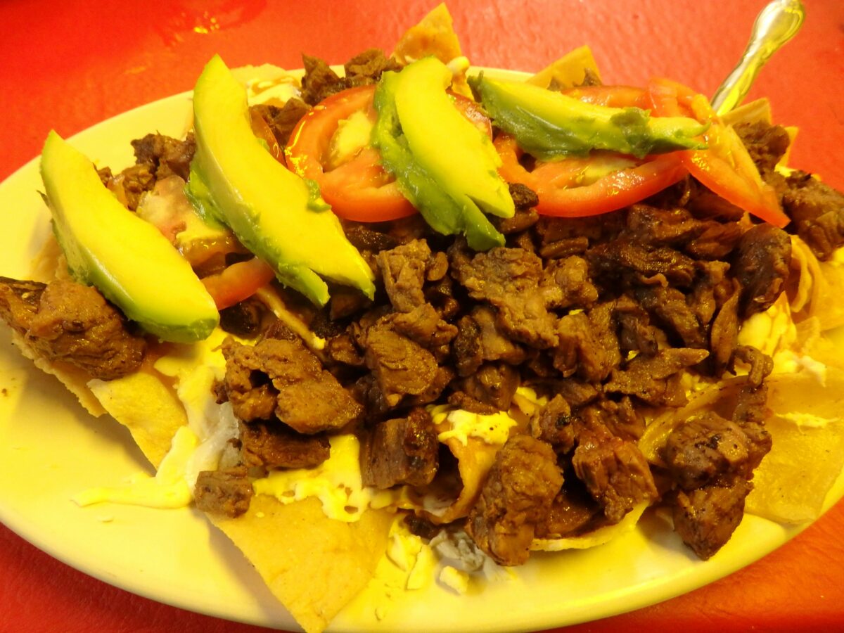 「ナチョス」は、トウモロコシ粉の生地にチーズをかけて溶けるまで焼いたものです。様々なソースをつけて食べることが多いのですが、牛ハラミの薄焼きを載せると「ナチョス・アラチェラ」となります。