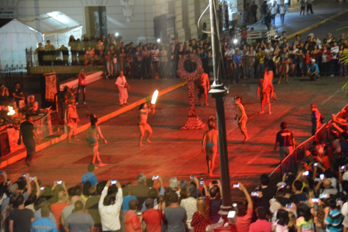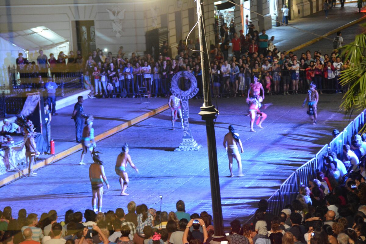メリダのソカロで金曜日に行われるマヤ文明期の儀式的な球技のショー