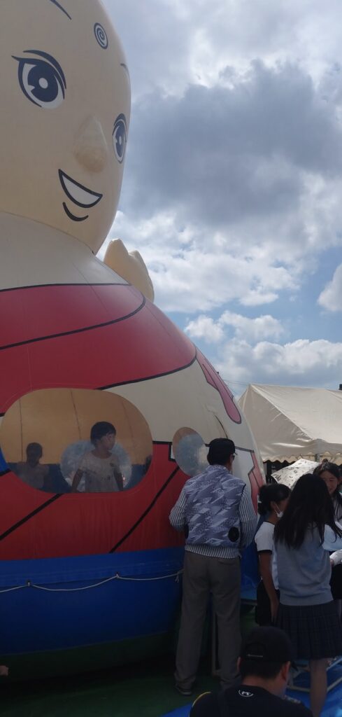 屋台は、焼きそばやかき氷といったお祭り定番グルメなどがあり、全部で18軒出ていました。アイスメロンパンや缶バッジ作りなどの普段ないような屋台もありました。運動場の端の方には消防車が停まっていて消防車に乗らせてもらったりたくさんの体験をさせてもらえます。ふわふわドームせんとくんは中に入って飛んだり跳ねたりできる遊具です。