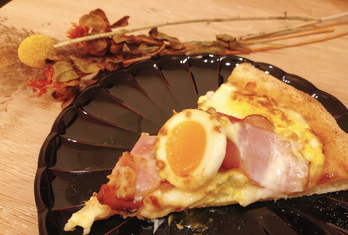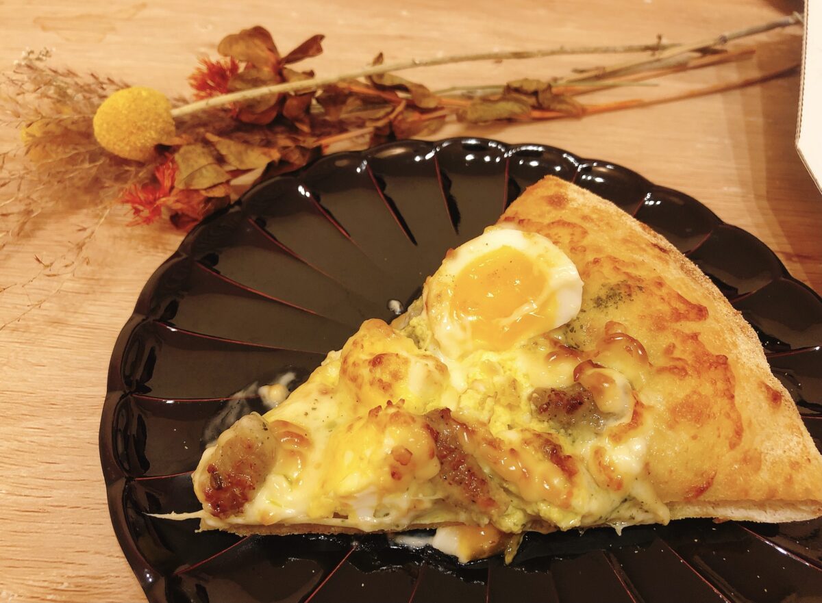 ベーコンのほかにもウィンナーが乗っていて、お子様ウケも良さそうな、シンプルな卵とベーコンの塩味の組み合わせを楽しめるピザでした。ホワイトソースが乗っているおかげでシンプルながらもしっかりと食べ応えを感じ、コクがアップしています。たまごサンドの中に、アツアツに焼いたベーコンやウインナーが入っているイメージといえばわかりやすいでしょうか?すこしモッチリした食感のあるピザ生地に、ボリューミーな具材がよく合っています。