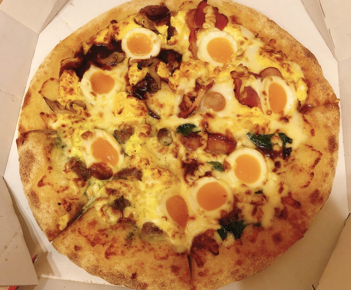 ベーコンのほかにもウィンナーが乗っていて、お子様ウケも良さそうな、シンプルな卵とベーコンの塩味の組み合わせを楽しめるピザでした。ホワイトソースが乗っているおかげでシンプルながらもしっかりと食べ応えを感じ、コクがアップしています。たまごサンドの中に、アツアツに焼いたベーコンやウインナーが入っているイメージといえばわかりやすいでしょうか?すこしモッチリした食感のあるピザ生地に、ボリューミーな具材がよく合っています。