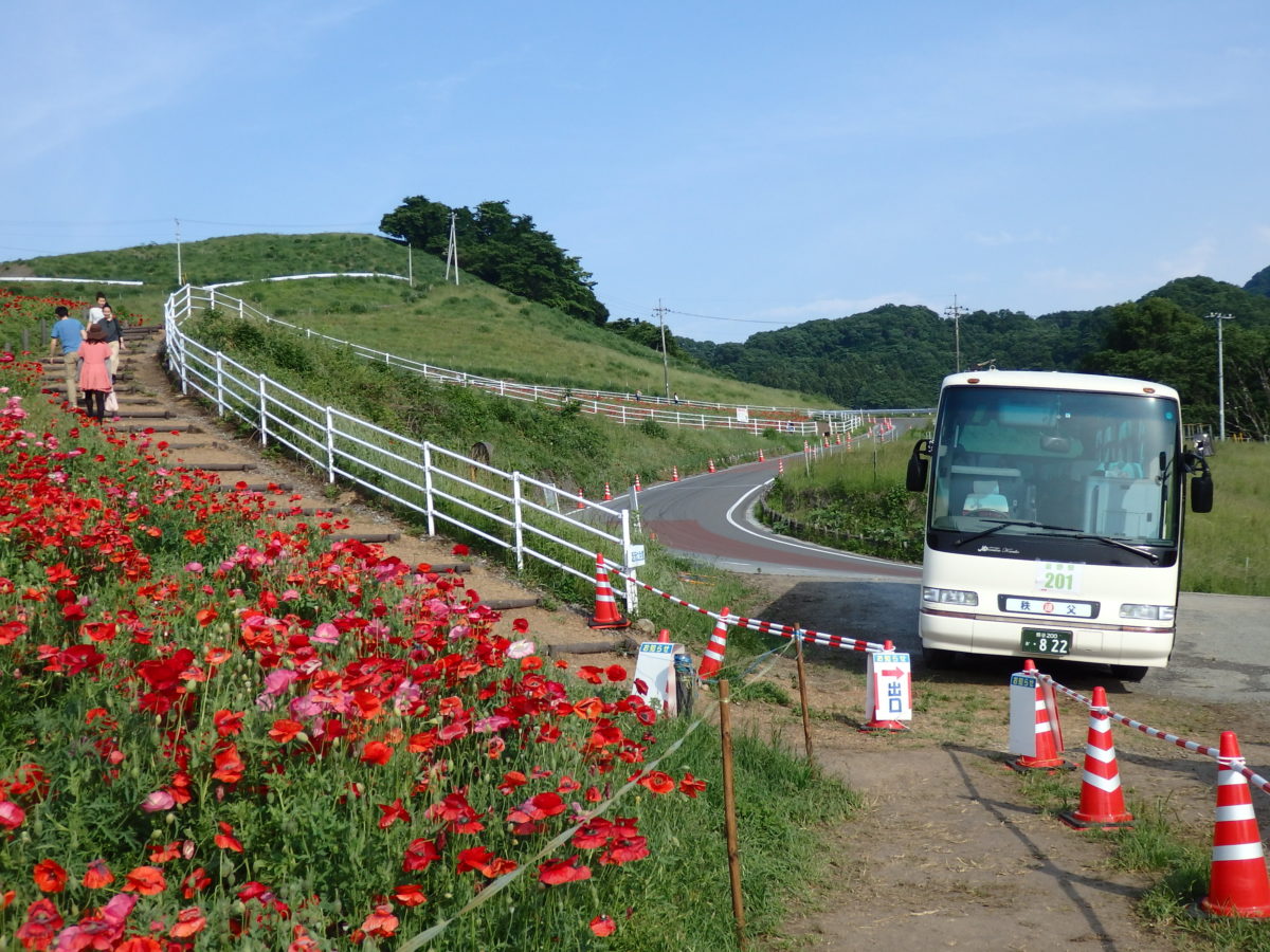 秩父高原牧場へは通常はマイカーでしか行けないのですが、「天空のポピー」開催期間中には、秩父鉄道の皆野駅前や東武東上線の小川町駅前から会場めでシャトルバスが運行されています。