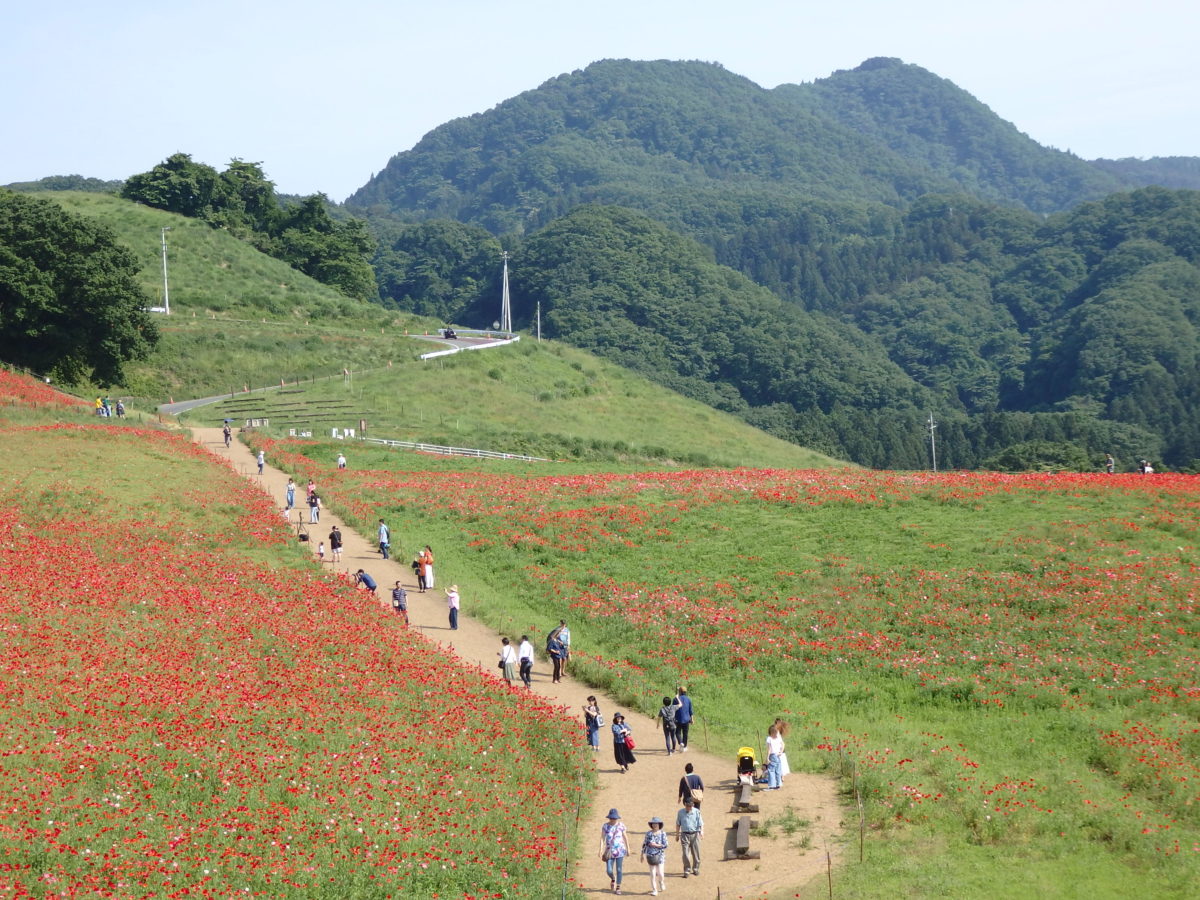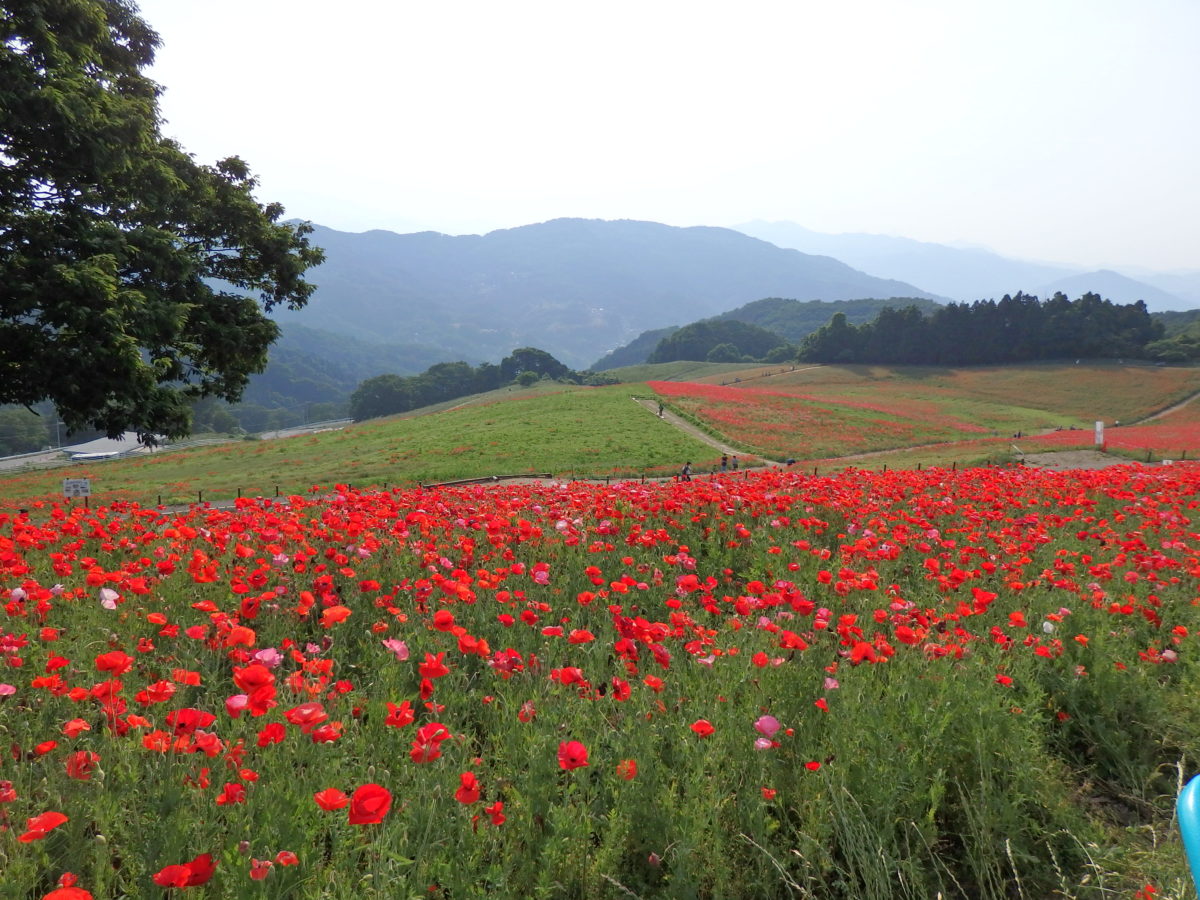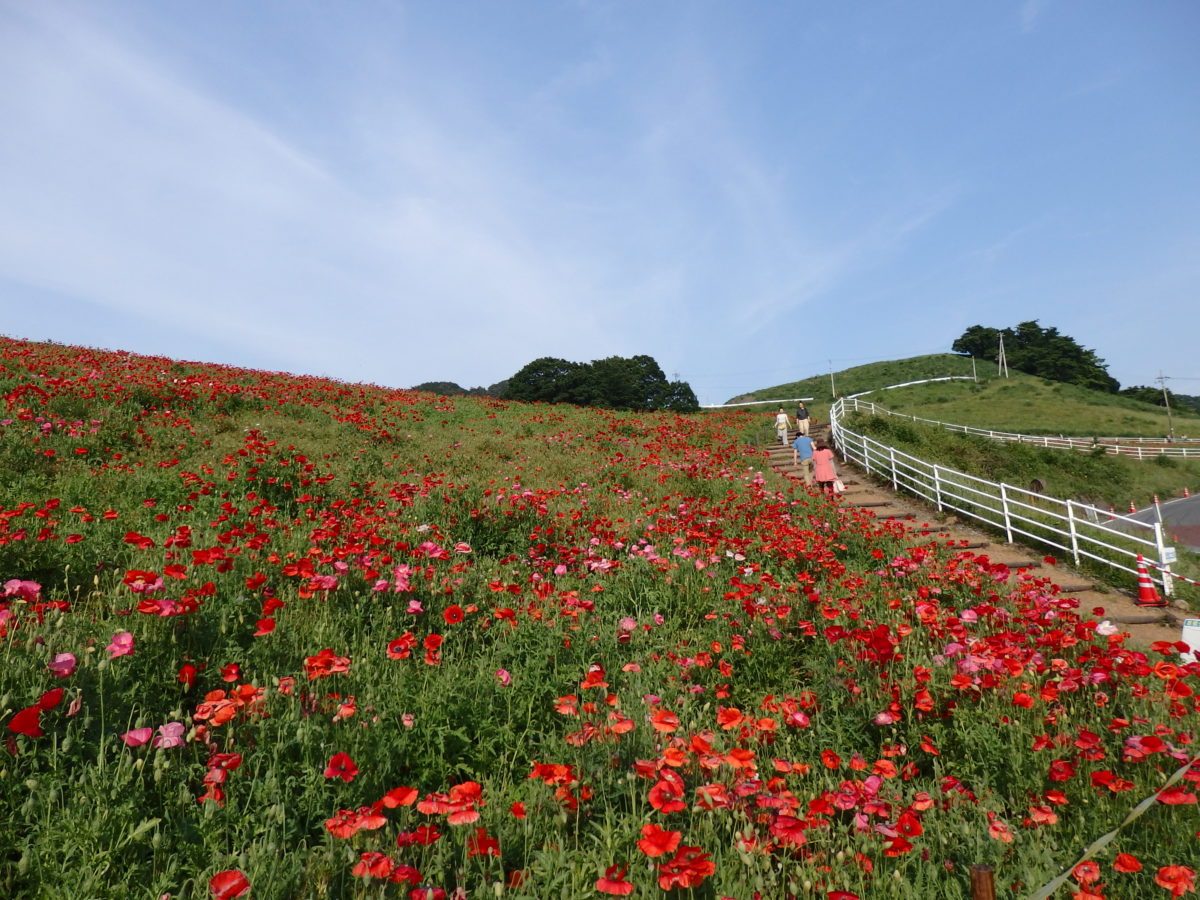 埼玉県の北西部に位置する皆野町の秩父高原牧場では毎年ポピーが栽培され、5月中旬から6月上旬にかけて高原を真赤に彩り、「天空のポピー」が開催されます。標高約500メートルの高原に青空と真赤なポピーの花が見事な色彩のコントラストを作り上げます。
