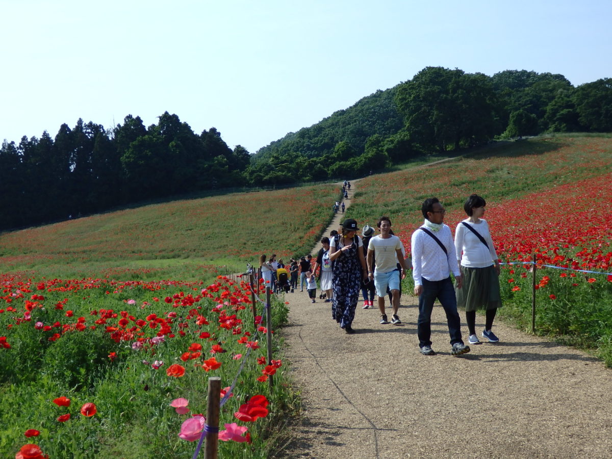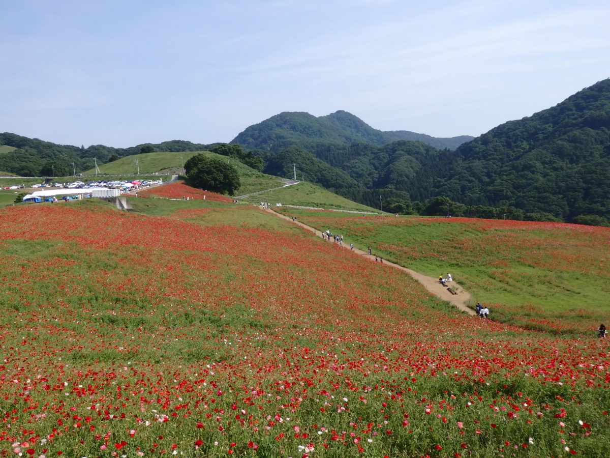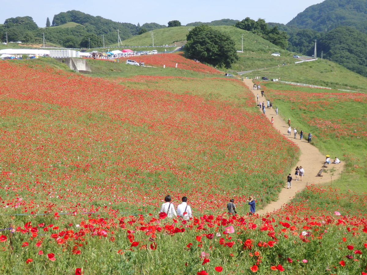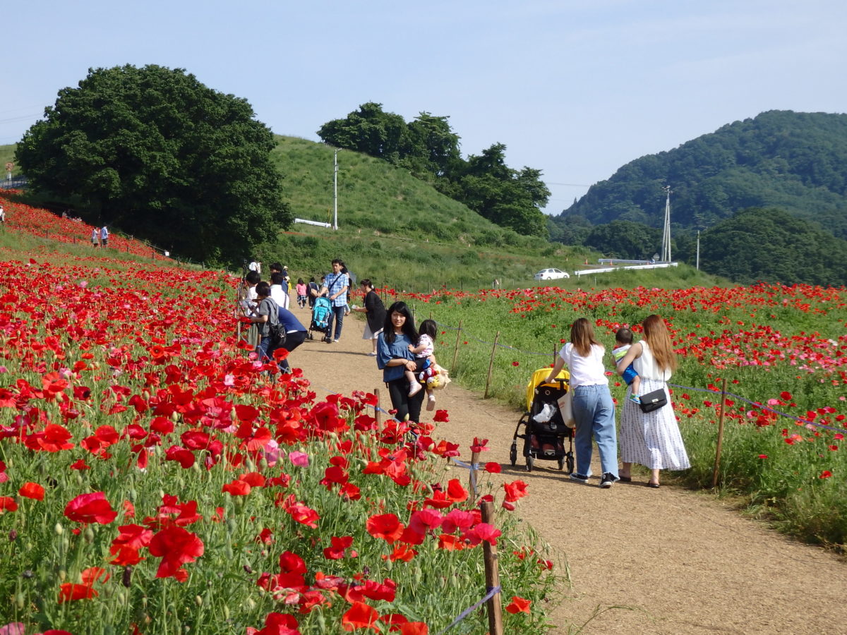 埼玉県の北西部に位置する皆野町の秩父高原牧場では毎年ポピーが栽培され、5月中旬から6月上旬にかけて高原を真赤に彩り、「天空のポピー」が開催されます。標高約500メートルの高原に青空と真赤なポピーの花が見事な色彩のコントラストを作り上げます。