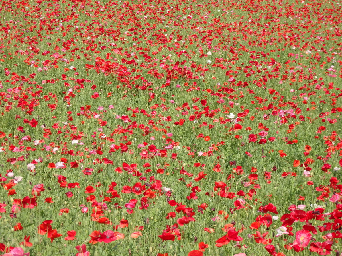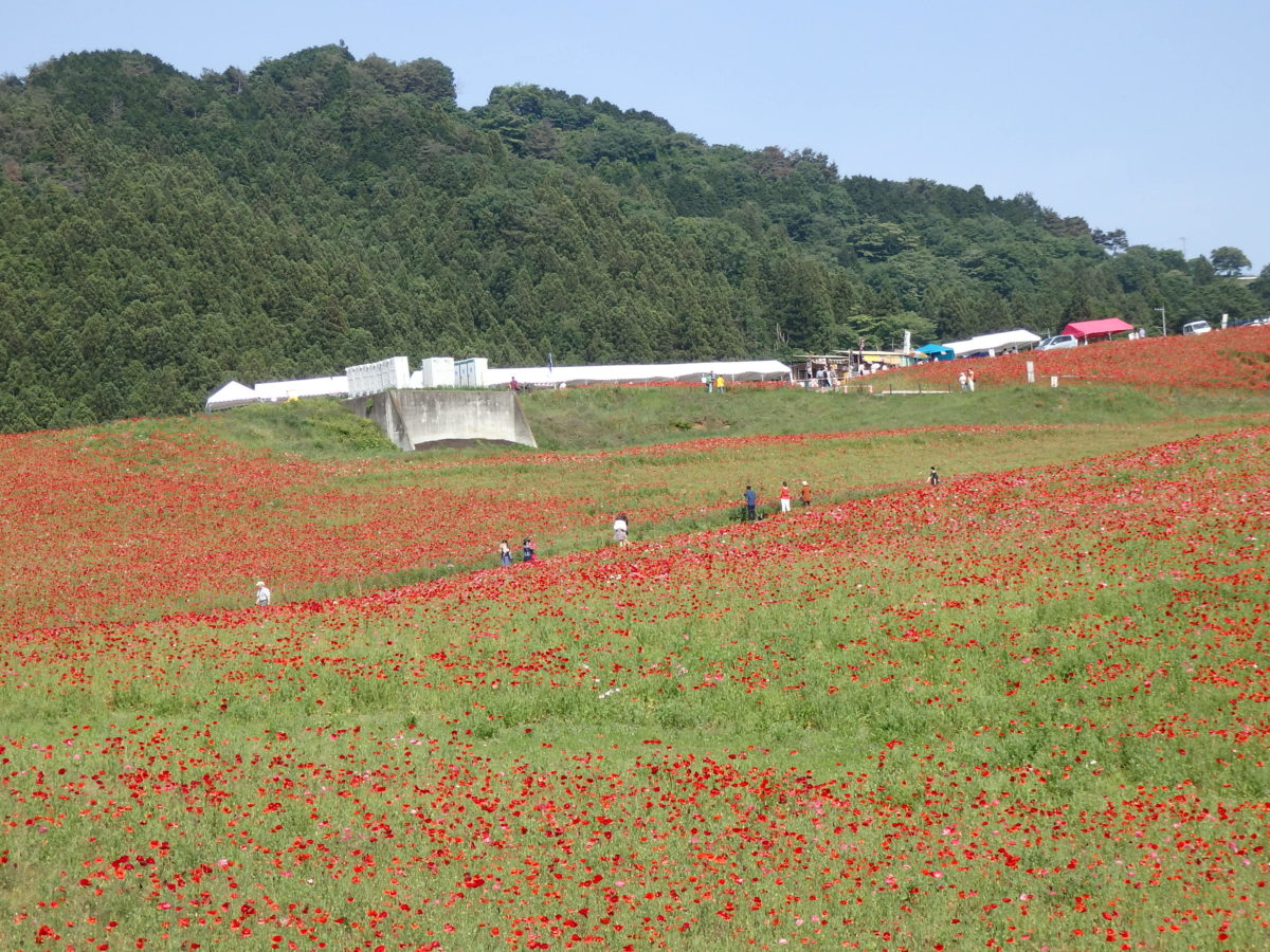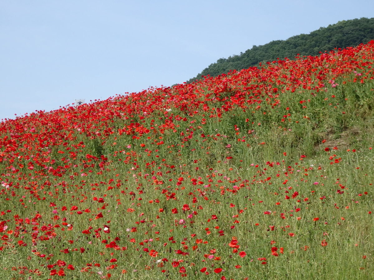 標高約500メートルの高原の約5ヘクタールの敷地を、1,500万本前後のポピーが真赤に染め上げます。