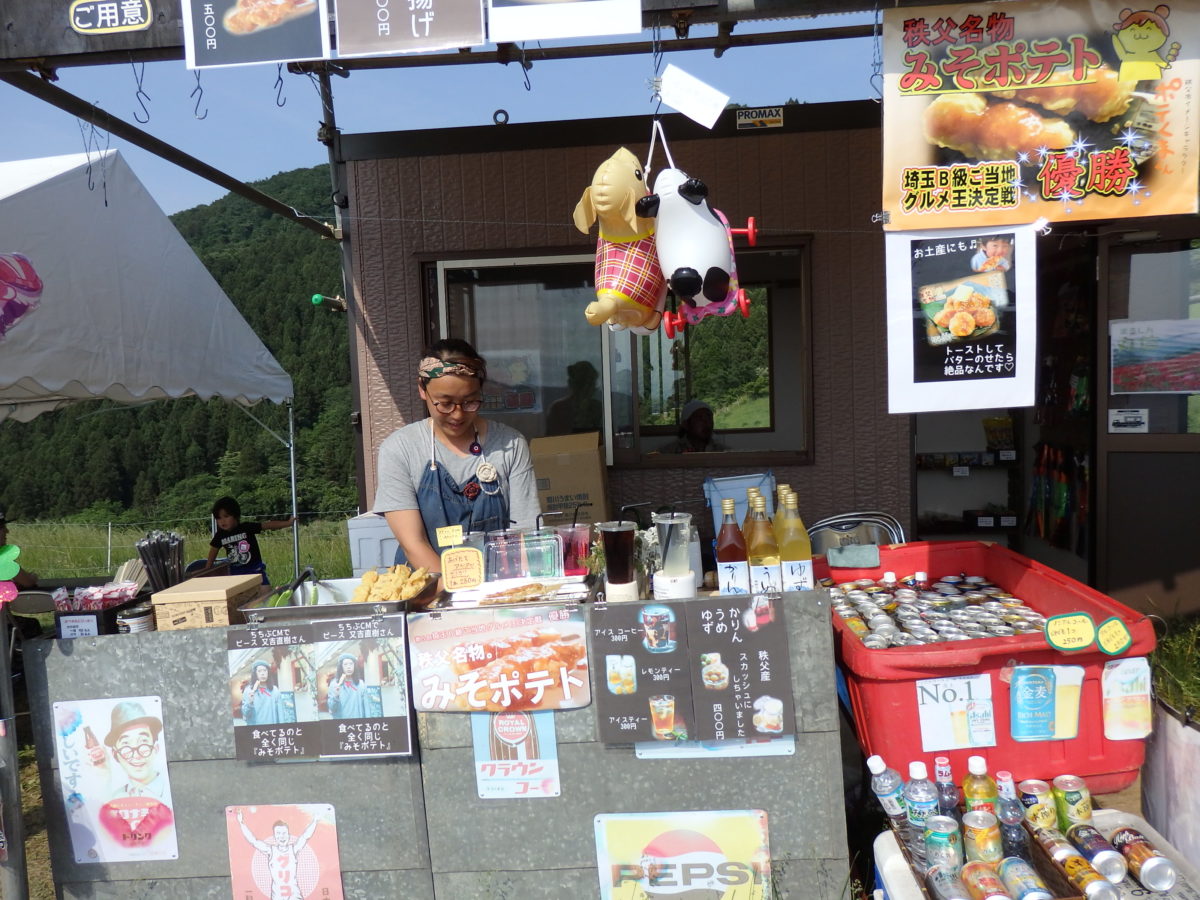 ポピー畑を一望できるところには、数々の露店が軒を連ねます。定番メニューの他に、秩父名物のみそポテトや秩父味噌おなめを販売する店も見かけられます。