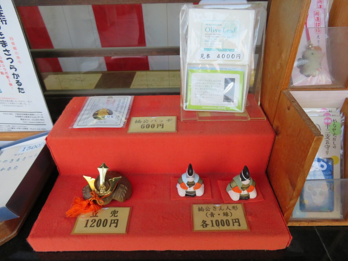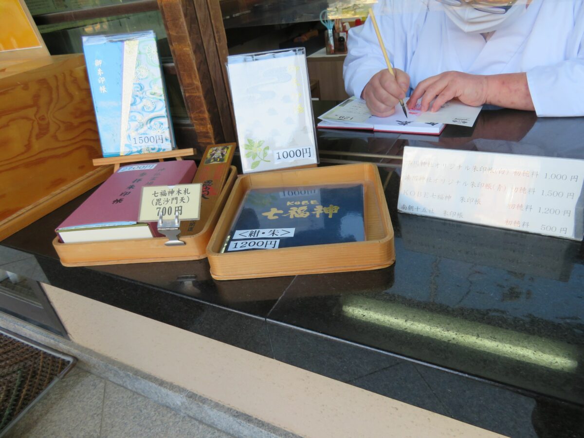 4種類の御朱印はどれも、本社社殿の西の授与所で頂くことができます。窓口にはオリジナルの御朱印帳も並んでいます。「菊水紋」を地模様とするもの、楠木正成の佩刀(はいとう)として伝承される太刀「小竜景光(こりゅうかげみつ)」をイメージしてデザインされたもの、KOBE七福神の文字が記された七福神めぐり専用のものなど、種類豊富です。